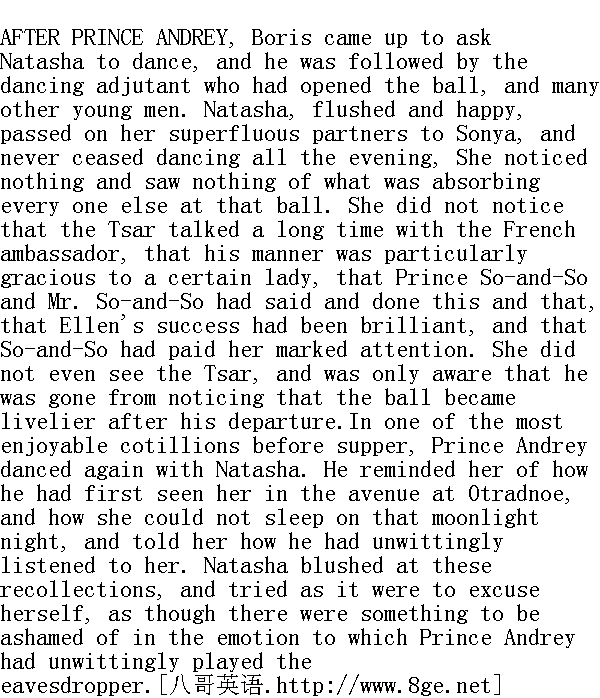 紧随安德烈公爵之后, 鲍里斯走到娜塔莎跟前, 邀请她跳舞, 宣布舞会开始的副官--舞蹈家, 还有一些年轻人也走到娜塔莎跟前, 邀请她跳舞, 娜塔莎把几个多馀的舞伴让给索尼娅, 她彻夜不停地跳舞, 满面通红, 显得很幸运。她没有注意什么, 也没有看见, 舞会上有什么事情使人人发生兴趣。她不仅没有发觉国王和法国公使谈了很久的话, 他特别慈祥地同某个女士交谈, 某个皇储和某人做了什么, 说了什么, 海伦大受欢迎, 博得某人的特别关顾, 她甚至没有看见国王, 只是在国王离开后舞会更加热闹, 她才发见国王已经离开了。晚餐前, 安德烈公爵又带着娜塔莎同跳那欢快的科季里昂舞。他使她想起他们在奥特拉德诺耶林荫道上首次相会的情景, 她在月明之夜不能入睡, 他偶尔听到她说话。一提起这些往事, 她满面通红, 极力地为她自己的举动辩护, 在安德烈公爵意识到他无意中偷听了她的话时, 心中仿佛有点儿不好意思。 Like all men who have grown up in society, Prince Andrey liked meeting anything not of the conventional society stamp. And such was Natasha with her wonder, her delight, her shyness, and even her mistakes in talking French. His manner was particularly tender and circumspect as he talked to her. Sitting beside her, and talking of the simplest and most trifling subjects, Prince Andrey admired the radiant brilliance of her eyes and her smile, that had no concern with what was said but was due simply to her own happiness. When Natasha was chosen again, and she got up with a smile and was dancing, Prince Andrey particularly admired her shy grace. In the middle of the cotillion, Natasha went back to her place, breathless at the end of a figure. Another partner again chose her. She was tired and panting, and evidently she thought for an instant of refusing, but immediately she put her hand on her partner's shoulder and was off again gaily, smiling to Prince Andrey. 安德烈公爵像所有在上流社会成长的人那样, 喜欢在上流社会中碰见那种未被打上上流社会共同烙印的东西。娜塔莎也是如此: 她流露着惊奇、欣喜和畏葸的神情, 说法国话时甚至有许多错误。他很温和地、小心谨慎地对待她并且怀着同样的态度同她谈话。安德烈公爵坐在她身旁, 和她谈论到最平凡的、最琐细的事情, 他正在欣赏她那眼睛和笑容所焕发的欣悦的光辉, 她不是由于他说的话而是由于内心的幸福而流露微笑。当人家挑选娜塔莎, 她面带微笑站起来, 在大厅中跳舞的时候, 安德烈公爵特别欣赏她那羞怯而优雅的姿态。当科季里昂舞跳到半中间的时候, 娜塔莎耍完了花样, 还在困难地喘气, 就向自己的坐位前面走去。新舞伴又邀请她。她疲倦了, 喘不过气来, 看样子, 她想拒绝, 但是又马上快活地把手搭在舞伴的肩上, 并且面向安德烈公爵微微一笑。 "I should have been glad to rest and sit by you. I'm tired; but you see how they keep asking me, and I'm glad of it, and I'm happy, and I love every one, and you and I understand all about it," and more, much more was said in that smile. When her partner left her side, Natasha flew across the room to choose two ladies for the figure." 我很想休息一下, 和您坐在一块儿, 我疲倦了, 可是您知道, 他们都在选我作舞伴, 我感到高兴, 我感到幸运, 我喜爱所有的人, 我和您都懂得这一切。"这种微笑仿佛说出了许多许多的话。当舞伴把她放开以后, 娜塔莎跑着穿过大厅, 拖到了两个女伴, 一同耍花样。 "If she goes first to her cousin and then to another lady, she will be my wife," Prince Andrey-greatly to his own surprise-caught himself saying mentally, as he watched her. She did go first to her cousin." 如果她首先走到她表姐面前, 然后就走到另一个女伴面前, 那末她将是我的妻子了。"安德烈公爵望着她, 完全出乎意料地对自己说。她首先走到她表姐面前。 "What nonsense does sometimes come into one's mind!" thought Prince Andrey, "but one thing's certain, that girl is so charming, so original, that she won't be dancing here a month before she will be married.... She's a rare thing here," he thought, as Natasha settled herself beside him, sticking in the rose that was falling out of her bodice." 有时候脑子里竟会想到多么荒诞无稽的话啊!"安德烈公爵想了想, "不过有一点倒是千真万确的: 这个女郎多么可爱, 多么特殊, 她在这儿还不消跳满一个月, 就会嫁人的......在此地她是稀有的珍宝。"当娜塔莎弄平硬腰带侧边的那朵玫瑰花、在他身旁坐下的时候, 他想道。