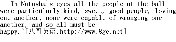 他们怎么会对什么事情表示不满呢?"娜塔莎想道, "尤其是像别祖霍夫这样的好人?"在娜塔莎看来, 凡是出席舞会的人都同样是仁慈的、可爱的、优秀的, 他们互相爱护, 谁也不会使谁难受, 因此人人应该是幸运的。