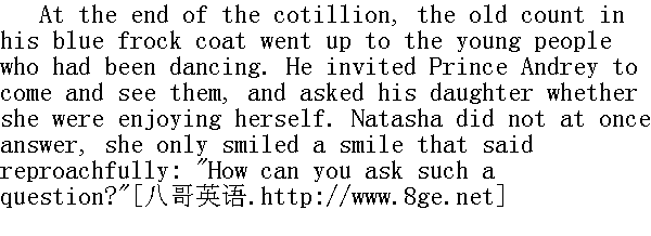 科季里昂舞跳完之后, 老伯爵穿着蓝色燕尾服走到跳舞的人跟前。他邀请安德烈公爵到他家里去做客, 又问问女儿, 她是否觉得快活?娜塔莎没有回答, 只是微微一笑, 这样的微笑带有责备的意味, 仿佛在说: "这一点怎么可以问呢?" "Enjoying myself as I never have before in my life!" she said, and Prince Andrey noticed how her thin arms were swiftly raised as though to embrace her father, and dropped again at once. Natasha was happy as she had never been in her life. She was at that highest pitch of happiness, when one becomes completely good and kind, and disbelieves in the very possibility of evil, unhappiness, and sorrow." 这一生从来没有这样快活啊!"她说道, 安德烈公爵发现, 她那双干瘦的手飞快地举起来抱住父亲, 旋即低垂下来, 娜塔莎在这一生中从来都没有这样幸福。她正处于极度的幸福之中, 此时一个人会变得十分仁慈和优秀, 他不相信在尘世之中会有恶事、不幸和悲痛。 At that ball Pierre for the first time felt humiliated by the position his wife took in the highest court circle. He was sullen and absent-minded. There was a broad furrow right across his forehead, as he stood in a window, staring over his spectacles and seeing no one. Natasha passed close by him on her way in to supper. Pierre's gloomy, unhappy face struck her. She stopped, facing him. She longed to come to his aid, to bestow on him some of her own overflowing happiness. "How delightful it is," she said; "isn't it?" 皮埃尔在这个舞会上头一次感觉到, 他的老婆在上层社会所占的地位使他自己蒙受屈辱。他神色郁闷, 漫不经心。他的额角上横着一条深深的皱纹, 他站在窗口, 透过眼镜向前望去, 没有望见任何人。娜塔莎去用晚餐时, 经过他身旁。 Pierre smiled an absent-minded smile, obviously not grasping what was said to him. "Yes, I'm very glad," he said. 皮埃尔那副阴沉的忧愁的面孔使她大吃一惊。她在他对面停步了。她很想助他一臂之力, 赐予他以剩馀的幸福。 "How can people be discontented at anything!" thought Natasha. "Especially any one as nice as Bezuhov."" 伯爵, 多么快活, "她说, "是吗?""对, 我很高兴。"他说。