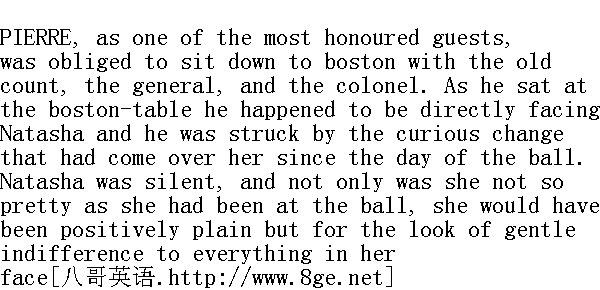 皮埃尔是最受尊敬的贵宾之一, 他应与伊利亚·安德烈伊奇、将军和上校坐在同一张波士顿牌桌上。在波士顿牌桌上, 皮埃尔恰好坐在娜塔莎对面, 自从举办舞会后, 她身上发生的可怕的变化使他大为惊讶。娜塔莎沉默寡言, 如果她不装出一幅温顺的、对一切事物漠不关心的样子, 她非但没有在舞会上那么俊俏, 而且会变得很难看了。 "What is wrong with her?" Pierre wondered, glancing at her. She was sitting by her sister at the tea-table; she gave reluctant answers to Boris at her side and did not look at him. After playing all of one suit and taking five tricks to his partner's satisfaction, Pierre, having caught the sound of greetings and the steps of some one entering while he took his tricks glanced at her again." 她怎么样了?"皮埃尔瞥了她一眼, 心中想道。她在茶桌旁坐在姐姐身边, 眼睛不望他, 不乐意地向挨着她坐下来的鲍里斯回答什么话。皮埃尔打出了同样花色的牌, 收起五张被吃掉的牌, 他的对手感到高兴, 这时他听见一片寒暄和走进房里来的步履声, 他又朝她瞥了一眼。 "Why, what has happened to her?" he said to himself in still greater wonder." 她出了什么事呢?"他愈益惊奇地自言自语。 Prince Andrey was standing before her saying something to her with an expression of guarded tenderness on his face. She, lifting her head, was looking at him, flushing crimson, and visibly trying to control her breathing, which came in panting gasps. And the vivid glow of some inner fire that had been quenched before was alight in her again. She was utterly transformed. From a plain girl she was once more the beautiful creature she had been at the ball. 安德烈公爵现出关怀备至的、温柔的表情站在她面前, 对她说着什么话。她抬起头来望着他, 满面通红, 显然她力图抑制急促的呼吸。从前业已熄灭的她的内心的火焰, 又复放射出明亮的光彩。她完全变样了。她又从那难看的模样变得像她在舞会上那样俊俏了。安德烈公爵走到皮埃尔跟前, 皮埃尔发现他朋友脸上重新流露出充满青春活力的表情。 Prince Andrey went up to Pierre, and Pierre noticed a new, youthful expression in his friend's face. Several times Pierre changed his seat during the play, sitting sometimes with his back to Natasha, sometimes facing her, and during all the six rubbers he was observing her and his friend. 在打纸牌的时候, 皮埃尔接连有几次改变坐位, 他时而把背对着娜塔莎, 时而把脸对着她, 在打六圈牌的当儿, 他不断地观察她和他自己的朋友。