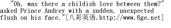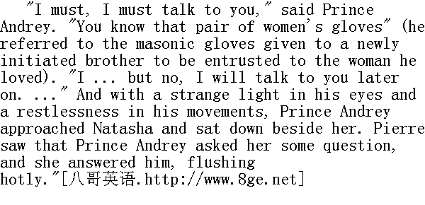 有过童年的爱情, 是吗?"安德烈公爵涨红了脸, 忽然出乎意料地问道。 "Yes. You know between cousins the close intimacy often leads to love. Cousinhood is a dangerous neighbourhood. Isn't it?"" 是啊。Vous savez entre consin et consine cette intimite mene quelquefois a l'amour: le conAsinage est un dangereux voisinage.N'est ce pas?"① ①法语: 您知道, 表兄妹之间的亲近, 常常会产生爱情。老表老表, 提心吊胆。不是吗? "Oh, not a doubt of it," said Prince Andrey, and with sudden and unnatural liveliness, he began joking with Pierre about the necessity of his being careful with his cousins at Moscow, ladies of fifty, and in the middle of these jesting remarks he got up, and taking Pierre's arm, drew him aside." 啊, 毫无疑问, "安德烈公爵说道, 他忽然不自然地活跃起来, 他开始跟皮埃尔开玩笑, 说皮埃尔对他那些五十来岁的莫斯科的表亲们要小心谨慎, 诙谐的谈话谈到半中间, 他站了起来, 挽起皮埃尔的手, 把他领到一旁去。 "Well, what is it?" said Pierre, who had been watching in wonder his friend's excitement, and noticed the glance he turned upon Natasha as he got up." 怎么啦?"皮埃尔说, 他惊讶地观察他朋友的异常兴奋的神色, 并且发觉他在站立时投向娜塔莎的目光。