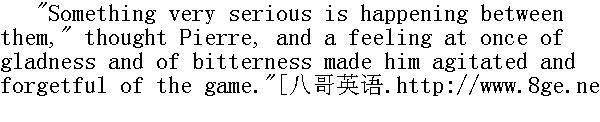 他们之间在发生什么很重大的事。"皮埃尔想道, 又喜又悲的感情使他激动不安, 快要忘记打牌了。 After six rubbers the general got up, saying it was of no use playing like that, and Pierre was at liberty. Natasha, at one side of the room, was talking to Sonya and Boris. Vera, with a subtle smile, was saying something to Prince Andrey. Pierre went up to his friend, and, asking whether they were talking secrets, sat down beside them. Vera, noticing Prince Andrey's attention to Natasha, felt that at a soiree, at a real soiree, it was absolutely necessary there should be delicate allusions to the tender passion, and seizing an opportunity when Prince Andrey was alone, began a conversation with him upon the emotions generally, and her sister in particular. She felt that, with a guest so intellectual as she considered Prince Andrey, she must put all her diplomatic tact into the task before her. When Pierre went up to them he noticed that Vera was in full flow of self-complacent talk, while Prince Andrey seemed embarrassed-a thing that rarely happened to him. 打完六圈牌, 将军站起来说, 这样玩下去令人受不了。于是皮埃尔就有了片刻的空闲时间。娜塔莎在一旁和索尼娅、鲍里斯谈话。薇拉带着含蓄的微笑跟安德烈公爵谈着什么话。皮埃尔走到自己的朋友跟前, 问他谈论的是否是秘密, 然后在他们近旁坐下。薇拉发现安德烈公爵注意娜塔莎, 她认为, 在晚会上, 在真正的晚会上, 对爱情的微妙的暗示是不可或缺的, 当安德烈公爵独自一人呆在那里的时候, 她抽出一会儿工夫, 开始同他谈论一般的爱情, 以及她妹妹的情形。她觉得对这样一个聪明的(她认为安德烈公爵是个聪明人)客人她必须运用自己的外交手腕。当皮埃尔走到他们跟前, 他发现, 薇拉正在洋洋自得地谈话, 安德烈公爵(对他来说, 这是少有的事)看样子感到困窘不安。 "What do you think?" Vera was saying with a subtle smile. "You, prince, have so much penetration and see into people's characters at once. What do you think about Natalie? Is she capable of constancy in her attachments? Is she capable, like other women" (Vera meant herself) "of loving a man once for all and remaining faithful to him for ever? That's what I regard as true love! What do you think, prince?"" 你认为怎样?"薇拉带着含蓄的微笑说, "公爵, 您富有洞察力, 一下子就能明白人们的性格。您对娜塔莎的看法怎样?她的依恋心能否坚定不移?她能否与其他妇女一样(薇拉所指的是她自己), 一爱上某人, 就永远对他忠贞不渝?我认为这是真正的爱情。公爵, 您认为怎样?" "I know your sister too little," answered Prince Andrey, with a sarcastic smile, under which he tried to conceal his embarrassment, "to decide a question so delicate; and, besides, I have noticed that the less attractive a woman is, the more constant she is apt to be," he added, and he looked at Pierre, who at that moment joined them." 您的妹妹, 我知道得太少了, "安德烈公爵带着讥讽的微笑答道, 他想在微笑之下掩饰他的窘态, "为了要解答这样一个微妙的问题, 我后来渐渐注意到, 女人越是不讨人喜欢, 她就越忠贞不渝。"他补充一句, 看了看这时向他们跟前走来的皮埃尔。 "Yes, that is true, prince. In these days," pursued Vera (talking of "these days," as persons of limited intellect as a rule love to do, supposing they have discovered and estimated the peculiarities of the times and that human characteristics do change with the times), "in these days a girl has so much liberty that the pleasure of being paid attention often stifles these feelings in her. And Natalie, it must be confessed, is very susceptible on that side."This going back to Natasha again made Prince Andrey contract his brows disagreeably. He tried to get up, but Vera persisted with a still more subtle smile." 是的, 这是实在的, 公爵, 在我们这个时代, "薇拉继续说(正像眼光狭小的人们那样, 总喜欢提到我们这个时代, 认为他们业已发现并且评定我们时代的特点, 认为人们的天性随着时代而起变化), "在我们这个时代, 女孩享有过多的自由, 以致le plaisir d'etre courtisee①往往淹没她内心的真实情感。Et Nathalie, il faut l'avouer, y est tres sensible②, 话题回到娜塔莎, 又使安德烈公爵闷闷不乐地蹙蹙额角;他想站起来, 但是薇拉带着更微妙的微笑继续说。 ②法语: 应当承认, 娜塔莉(娜塔莎的法语称谓)对这件事是很敏感的。 "Nobody, I imagine, has been so much run after as she has," Vera went on; "but no one, until quite of late, has ever made a serious impression on her. Of course, you know, count," she turned to Pierre, "even our charming cousin, Boris, who, entre nous, was very, very far gone in the region of the tender passion ..." She intended an allusion to the map of love then in fashion." 我以为, 谁也不比她更像courtisee, "③薇拉说, "可是直到近来, 她从来还没有认真地喜欢过什么人。伯爵。您知道, "她把脸转向皮埃尔说, "就连我们可爱的表弟鲍里斯, enAtre nous④也深深地沉没于dans le pays du tendre......"⑤她所暗指的是当时广为流行的爱情图。 ③法语: 追求的对象。 ④法语: 在我们之间说说, 不可与外人道也。 Prince Andrey scowled, and was mute. 安德烈公爵现出阴郁的神色, 默不作声。 "But, of course, you are a friend of Boris's?" Vera said to him" 您不是跟鲍里斯和睦相处吗?"薇拉对他说。 "Yes, I know him. ..."" 是啊, 我知道他......" "He has probably told you of his childish love for Natasha?"" 他想必向您谈过童年时代他对娜塔莎的爱情吧?"