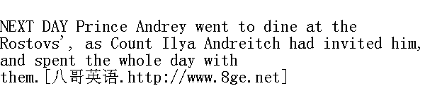 第二天, 伊利亚·安德烈伊奇伯爵邀请安德烈公爵, 他于是乘车前往罗斯托夫家出席午宴, 并且在他们家中消度了整整一天。 Every one in the house perceived on whose account Prince Andrey came, and he openly tried to be all day long with Natasha.Not only in the soul of Natasha-scared, but happy and enthusiastic-in the whole household, too, there was a feeling of awe, of something of great gravity being bound to happen. With sorrowful and sternly serious eyes the countess looked at Prince Andrey as he talked to Natasha, and shyly and self-consciously tried to begin some insignificant talk with him as soon as he looked round at her. Sonya was afraid to leave Natasha, and afraid of being in their way if she stayed with them. Natasha turned pale in a panic of expectation every time she was left for a moment alone with him. Prince Andrey's timidity impressed her. She felt that he wanted to tell her something, but could not bring himself up to the point. 全家人都能意识到, 安德烈公爵为何人而来, 他不加隐瞒, 整天都在想方设法和娜塔莎呆在一起。娜塔莎惊惶失措, 但她感觉到幸福和喜悦, 不仅在她心中, 而且在全家人心中都产生一种恐惧感, 担心将要发生重大的事情。当安德烈公爵和娜塔莎谈话的时候, 伯爵夫人用那忧愁而且严峻的目光注视他, 当他骤然回头望她的时候, 她就胆怯地、虚假地开始谈论一些琐碎的事情。索尼娅害怕离开娜塔莎, 当她和安德烈公爵呆在一起的时候, 她又怕成为他们的障碍。当娜塔莎单独和他在一起停留片刻的时候, 她由于害怕期待的事情会发生而面色苍白。安德烈公爵的腼腆的神情使她感到惊奇。她觉得他要对她说些什么话, 但他拿不定主意。 When Prince Andrey had gone away in the evening, the countess went up to Natasha and whispered: 夜晚安德烈公爵离开后, 伯爵夫人走到娜塔莎跟前, 低声说: "Well?"" 怎么啦?" "Mamma, for God's sake, don't ask me anything just now. This one can't talk of," said Natasha." 妈妈, 看在上帝份上, 现在您不要问我什么。这一点没法跟您说。"娜塔莎说。