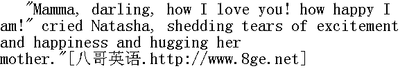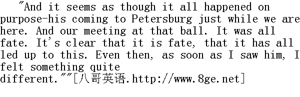 目前我们在彼得堡, 他自然特意到这里来。我们自然在这次舞会上相逢了......这一切都是命定的。很明显, 这是命运, 这一切都是命中注定的。当时我一看见他, 我就感到有点儿非同一般。" "What has he said to you? What are those verses? Read them ..." said the mother thoughtfully, referring to the verses Prince Andrey had written in Natasha's album." 他对你说过些什么话?那是一首什么诗呢?你念给我听......"母亲若有所思地说, 她一面问到安德烈公爵写在娜塔莎的纪念册上的诗句。 "Mamma, does it matter his being a widower?"" 妈妈, 他是个光棍, 不难为情么?" "Hush, Natasha. Pray to God. Marriages are made in heaven," she said, quoting the French proverb." 娜塔莎, 够了, 说到哪儿去了。祷告上帝吧, Les mariages se font dans les cieux.①" ①法语: 婚姻是由天定的。