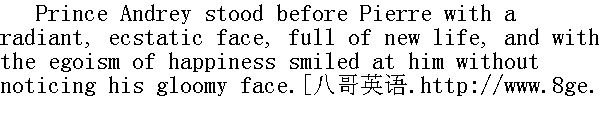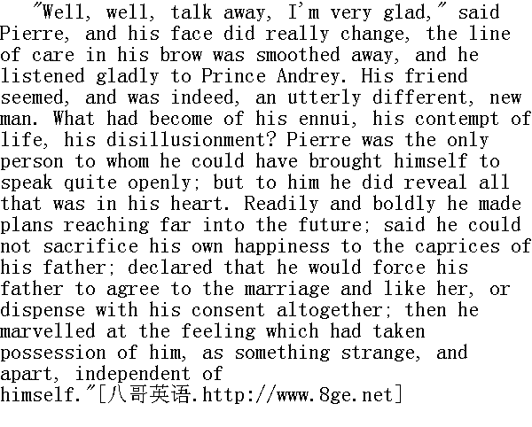 喂, 喂, 您说吧, 我很高兴, "皮埃尔说, 他的脸色真的变了, 有一条皱纹舒展开了, 他愉快地倾听安德烈公爵说话。安德烈公爵好像是一个截然不同的新人物了。他的悲伤、他对人生的蔑视和绝望的心情在哪里了?皮埃尔是他敢于倾吐心情的唯一的人, 于是他便把他心里要讲的话向他一股脑儿说出来。他时而轻松地、大胆地制订长远规划, 他说到他万万不能牺牲自己的幸福去满足他父亲随心所欲的要求, 他必将迫使他父亲同意这门婚事并且疼爱她, 或则, 未经他许可, 也要办成婚事;他时而表示惊讶, 对这种古怪的、陌生的、不以他的意志为转移的感情表示惊讶, 对那控制他的感情也表示惊讶。 "I should never have believed it, if any one had told me I could love like this," said Prince Andrey. "It is utterly different from the feeling I once had. The whole world is split into two halves for me: one-she, and there all is happiness, hope, and light; the other half-all where she is not, there all is dejection and darkness...."" 如果有人对我说, 我会这样热恋她, 我就不相信他了, "安德烈公爵说, "这根本不是我原有的那种感情。对我来说, 整个世界已分成两个一半: 一半只有她, 那里充满着幸福、希望和光明;另一半中没有她, 那里充满着沮丧和黑暗......" "Darkness and gloom," repeated Pierre; "yes, yes, I understand that."" 黑暗和阴郁, "皮埃尔重复地说, "对, 对, 这一点我是明白的。" "I can't help loving the light; that's not my fault; and I am very happy. Do you understand me? I know you are glad for me."" 我不能不爱光明, 对于这一点我没有过失。我非常幸福。你懂得我的意思吗?我知道, 你为我感到高兴。" "Yes, yes," Pierre assented, looking at his friend with eyes full of tenderness and sadness. The brighter the picture of Prince Andrey's fate before his mind, the darker seemed his own." 对, 对。"皮埃尔一面承认, 一面用那深受感动的忧郁的目光望着自己的朋友。他觉得安德烈公爵的命途愈益光明, 而他自己的命途就显得愈益黑暗。