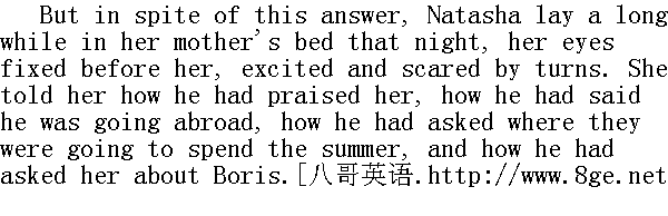尽管如此, 这天夜晚娜塔莎时而激动不安, 时而胆战心惊, 带着凝滞的目光久久地躺在母亲床上。她向她述说, 他怎样夸奖她, 他说他将要到国外去, 他探问他们在何地度过这个夏天, 他也问到鲍里斯的情况。 "But anything like this, like this ... I have never felt before!" she said. "Only I'm afraid with him, I'm always afraid with him. What does that mean? Does it mean that it's the real thing? Mamma, are you asleep?"" 可是, 我从来没有碰见这样的、这样的事情!!"她说。"只不过在他面前我感到害怕, 在他面前我总感到害怕, 这意味着什么?意味着, 这不就是真的害怕, 对吗?妈妈, 您睡着了?" "No, my darling. I'm afraid of him myself," answered her mother. "Go to bed."" 没有, 我的心肝, 连我自己也感到害怕, "妈妈答道, "你去睡吧。" "Anyhow, I shouldn't go to sleep. How stupid sleep is! Mamma, mamma, nothing like this have I ever felt before," she said, with wonder and terror at the feeling she recognised in herself. "And could we ever have dreamed! ..."" 我反正不愿意睡觉。睡觉是一件多么愚蠢的事啊!妈妈, 妈妈, 我从来没有碰见这样的事啊!"在意识到她自己内心的感情之前, 她带着惊奇而恐惧的神情说, "我们不会想到吧......"! It seemed to Natasha that she had fallen in love with Prince Andrey the first time she saw him at Otradnoe. She was as it were terrified at this strange, unexpected happiness that the man she had chosen even then (she was firmly convinced that she had done so)-that very man should meet them again now and be apparently not indifferent to her. 娜塔莎觉得, 还是在奥特拉德诺耶初次看见安德烈公爵的时候, 她就爱上他了。这种奇怪的出乎意料的幸福仿佛使她感到害怕, 她当时选择的那个人(她对此坚信不移)正是那个人, 又遇见她了, 看来他对她不是漠不关心的。