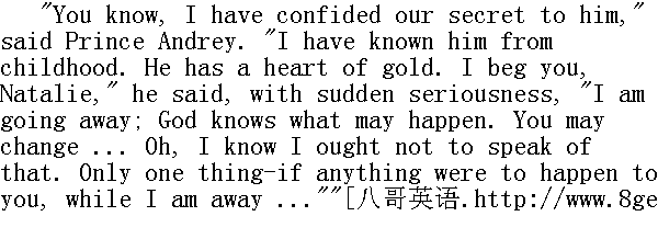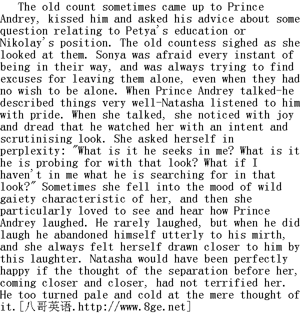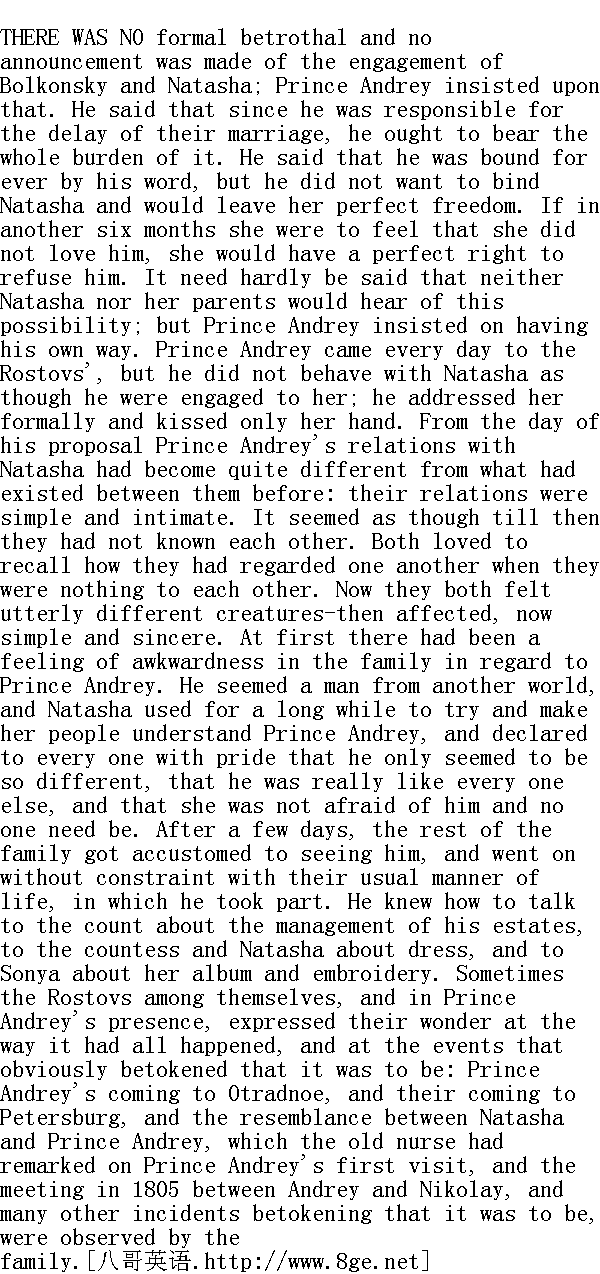 没有举行订婚礼, 博尔孔斯基和娜塔莎订婚的事亦未向任何人宣布, 安德烈公爵坚持这样做。他说推迟结婚是他的过错, 因此延期的全部重担都应当落在他身上。他说他永远要用诺言来约束自己, 但是他不愿意束缚娜塔莎, 给予她以充分自由。如果在半年之后她觉得她不爱他, 她有摆脱他的权利, 只要拒绝他就行。不言而喻, 无论是双亲, 还是娜塔莎, 都不愿意听见这件事, 然而安德烈公爵固执己见。安德烈公爵每天都到罗斯托夫家里去, 但他不以未婚夫身份和娜塔莎交际。他称她为"您", 只吻她的手而已。在提婚的那天以后, 安德烈公爵和娜塔莎之间建立了和从前截然不同的、亲密的纯朴关系。他们好像直到现在才相互认识似的。无论是他, 还是她都喜欢回想他们一无所有的时候彼此对对方的看法, 现在他们两个人都觉得自己成为迥然不同的人了, 那时是虚情假意, 现在是纯朴和诚实。最初, 家里人和安德烈公爵交往时都感到尴尬, 他好像是个陌生世界里的人物, 娜塔莎久而久之才使家里人和安德烈公爵混熟了, 她而且很自豪地要大家相信, 他只是像个特殊人物, 其实他和众人, 都是同样的人, 她也使众人相信, 她并不怕他, 谁也不应该怕他。过了几天, 家里人和他混熟了, 不觉得拘束, 他们于是乎在他面前采取原有的生活方式, 他也参与他们家里的生活。他擅长与伯爵谈论产业, 和伯爵夫人及娜塔莎谈论衣着, 与索尼娅谈论纪念册和十字布。有时候, 罗斯托夫家里人彼此之间, 或者在安德烈公爵面前都对以下情形感到惊奇, 这门婚事是怎样谈妥的, 这种种征兆怎么会如此明显: 安德烈公爵抵达奥特拉德诺耶、他们抵达彼得堡、娜塔莎和安德烈公爵的相貌相似(保姆在安德烈公爵第一次来访时就注意到了)、一八○五年安德烈和尼古拉之间的冲突, 还有已被家里人注意到的业已发生的事件的许多别的征兆。 The house was full of that poetic atmosphere of dullness and silence, which always accompanies the presence of an engaged couple. Often as they all sat together every one was silent. Sometimes the others got up and went away, and the engaged pair were still as mute when they were left alone. Rarely they spoke of their future life together. Prince Andrey felt frightened and ashamed to speak of it. Natasha shared the feeling, as she did all his feelings, which she never failed to divine. Once Natasha began questioning him about his son.Prince Andrey blushed-a thing frequent with him at that time, which Natasha particularly liked to see-and said that his son would not live with them. 未婚夫妇在场的时候, 这里常常充满着富有诗意的苦闷和沉寂的气氛。他们都坐在一起, 常常默默无语。有时候大伙儿站了起来走开了, 只剩下未婚夫妇二人, 他们也默默无言。他们很少谈到自己未来的生活。安德烈公爵谈到这件事时觉得害怕和惭愧。娜塔莎有此同感, 她经常猜透安德烈公爵所有的感情。有一回娜塔莎问起他的儿子。安德烈公爵涨红了脸, 现在他常常满面通红, 这一点娜塔莎特别喜欢, 他说, 他的儿子是不会住在他们一起的。 "Why not?" said Natasha, taking fright." 为什么?"娜塔莎吃惊地说。 "I cannot take him from his grandfather and then..."" 我不能从爷爷那儿把他夺走, 而且......" "How I should have loved him!" said Natasha, at once divining his thought; "but I know you want to avoid any pretext for our being blamed."" 我多么喜爱他啊!"娜塔莎立刻猜透了他的心思, 她说, "但是我知道, 您希望避免那种责难您和我的藉口。"