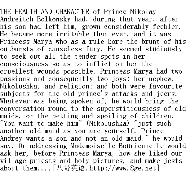在儿子走后的一年之内, 老公爵尼古拉·安德烈耶维奇·博尔孔斯基的身体很弱了, 意志力也衰退了。他已经变得比从前更易于激动, 多半在公爵小姐玛丽亚身上发泄他那无缘无故的怒火。他仿佛极力挑剔她的各种弱点, 尽量残酷地从精神上折磨她。公爵小姐玛丽亚有两种癖好, 因而也就有两种欢乐: 侄子尼古卢什卡和宗教, 二者都是老公爵所喜爱的、用以进攻和嘲笑的题材。无论说什么, 他总把话题归结为老处女的迷信和子女的娇生惯养。"你想把他(尼古卢什卡)变成像你这样的老处女, 白费心机;安德烈公爵所需要的是儿子, 而不是处女。"他说。或者在他和布里安小姐打交道时, 他一面在公爵小姐玛丽亚面前问她, 她可喜欢我们的神甫和神像, 他一面开玩笑...... He was constantly wounding Princess Marya's feelings, but his daughter needed no effort to forgive him. Could he be to blame in anything he did to her, could her father, who as she knew in spite of it all, loved her, be unjust? And indeed what is justice? Princess Marya never gave a thought to that proud word, "justice." All the complex laws of humanity were summed up for her in one clear and simple law-the law of love and self-sacrifice, laid down by Him who had in His love suffered for humanity, though He was God Himself. What had she to do with the justice or injustice of other people? All she had to do was to suffer and to love; and that she did. 他不断地、无情地侮辱公爵小姐玛丽亚, 为了原谅他, 他女儿甚至不能克制自己了。他难道会得罪女儿吗?难道她的父亲(她毕竟知道, 他是喜爱她的)会不公平吗?而且什么是公平呢?公爵小姐从来都没有想到这个值得骄傲的词儿: "公平"。对她来说, 人类所有的复杂的法则, 可集中为一个简而明的法则, 即是博爱和自我牺牲的法则, 也就是那个怀有博爱之心为全人类而备受苦难的上帝本身传授给我们的法则。他人的公平或不公平与她何干呢?她自己应当蒙受苦难, 热爱他人, 而且她也这样做了。 In the winter Prince Andrey had come to Bleak Hills, had been gay, gentle, and affectionate, as Princess Marya had not seen him for years. She felt that something had happened to him, but he said nothing to his sister of his love. Before his departure, Prince Andrey had a long conversation with his father, and Princess Marya noticed that they were ill pleased with each other at parting. 冬天安德烈公爵常到童山来, 他很快活而温和, 公爵小姐玛丽亚很久都没有看见他这副模样了。她预感到他发生了什么事情, 但他对公爵小姐玛丽亚没有谈到任何爱情问题。安德烈公爵在动身前和父亲交谈, 谈了很久, 公爵小姐玛丽亚注意到他们俩个人在他动身前彼此都表示不满。 Soon after Prince Andrey had gone, Princess Marya wrote from Bleak Hills to her friend in Petersburg, Julie Karagin, whom Princess Marya had dreamed-as girls always do dream-of marrying to her brother. She was at this time in mourning for the death of a brother, who had been killed in Turkey. 安德烈公爵走后不久, 公爵小姐玛丽亚在童山给彼得堡的朋友朱莉·卡拉金娜写了一封信, 公爵小姐玛丽亚和姑娘们一样, 平常也怀着那种幻想, 即是希望朱莉·卡拉金娜嫁给她哥哥, 这时候她的朋友正在为捐躯于土耳其的哥哥服丧。 "Sorrow, it seems, is our common lot, my sweet and tender friend Julie." 亲爱的、温柔的朋友朱莉, 悲恸看来是我们共同的厄运。