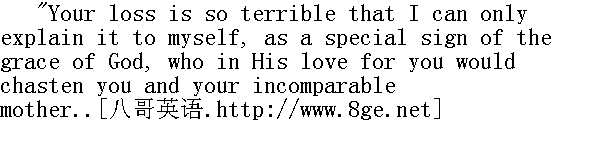 您的损失是如此骇人, 以致我只能向我自己说明, 这是上帝的特殊恩赐, 他因为爱您而想考验您和您的优秀的母亲。 "Ah, my dear, religion, and religion alone can-I don't say comfort us-but save us from despair. Religion alone can interpret to us what, without its aid, man cannot comprehend: to what end, for what cause, good, elevated beings who are able to find happiness in life, not injuring others, but indispensable to their happiness, are called away to God, while the wicked, the useless, injuring others and a burden to themselves and others, are left living. The first death which I have seen, and which I shall never forget-the death of my dear little sister-in-law-made on me just the same impression. Just as you question destiny, and ask why your noble brother had to die, so did I wonder what reason there was for that angel Liza to die-who had never done the slightest harm to any one, never even had a thought in her heart that was not kind. And yet-do you know, dear friend-five years have passed since then, and even I, with my poor intelligence, begin now to understand clearly why it was needful she should die, and in what way that death was but an expression of the boundless grace of the Creator, all of whose acts, though for the most part we comprehend them not, are but manifestations of His infinite love for His creatures. Perhaps, I often think, she was of too angelic an innocence to have the force to perform all a mother's duties. As a young wife, she was irreproachable; possibly she could not have been equally so as a mother. As it is, not only has she left us, and particularly Prince Andrey, the purest memories and regrets, but there she is in all likelihood receiving a place for which I dare not hope for myself. But not to speak of her alone, that early and terrible death has had the most blessed influence on me and on my brother, in spite of all our grief. At the time, at the moment of our loss, I could not have entertained such thoughts; at that time I should have dismissed them in horror, but now it seems clear and incontestable. I write all this to you, dear friend, simply to convince you of the Gospel truth, which has become a principle of life for me: not one hair of our head falls without His will. And the guiding principle of His will is only His infinite love for us, and so whatever may befall us, all is for our good 啊, 我的朋友, 宗教, 唯独宗教, 不用说, 才能安慰我们, 使我们摆脱失望的境地, 唯独宗教能够向我们说明人类在缺乏宗教帮助下所无法理解的问题;为何目的、为何缘由那些善良、高尚、善于在生活中寻找幸福、不仅不伤害任何人, 而且是对他人的幸福不可缺少的人竟会应召去见上帝, 而那些恶毒的, 毫无用处的危害份子, 或者那些成为自己和他人的累赘的人却幸存于世。我所看见的永志不忘的第一个人的死亡--我那亲爱的嫂嫂的死亡给我造成了这种印象。如同您也问到人的命运那样, 您那最优秀的哥哥为什么应当捐躯, 我也同样地问到, 丽莎非但没有危害他人, 而且她的心灵中除了美好的思想而外, 从来没有任何邪念, 为何这个安琪儿竟会死去呢。我的朋友, 这是怎么回事?你瞧, 从那时起, 已经度过五年了, 我只凭我这微不足道的智慧就已经开始明白, 她为何应当死去, 这种死只是创世主的无限仁慈的表现, 他的所作所为虽然我们多半不了解, 但是这只是他对自己的造物的无限仁爱的表现而已。也许我常常这样想, 她过分纯洁无瑕, 宛如安琪儿, 以致她无力承担母亲的义务。她这个年轻的妻子是无疵可剔的, 她也许不能做个这样的母亲。而且目前她所遗留给我们的, 特别是遗留给安德烈公爵的只有纯粹的怜惜和怀念。她在阴间里大概会获得我们不敢替自己希冀的那种地位。可是无须乎只论及她一个人, 这种可怕的夭折尽管令人悲恸欲绝, 但是这对我和对我哥哥都有极其良好的影响。那时候, 在遭受损失的时刻, 我脑海中不可能出现这个念头, 那时候我怀着恐惧的心理撇开了这个念头, 但是现在这个问题非常明显, 而且无容置疑了。此刻我把这一切写给您看, 我的朋友, 只是为了使您相信那作为我的生活准则的福音书中的真理: 如果上帝不同意, 就连一根头发也不会从我们头上掉下来。而上帝的意志所依据的只是对我们的无限的仁爱, 因此我们无论发生什么事, 一切都是为了我们的福利。您问我们是不是在莫斯科度过来冬?虽然我有和您会面的愿望, 但是我不想也不希望这样做。您会感到惊奇的是, 波拿巴成了碍事的原因。这就是因为: 我父亲的身体已明显地衰弱: 他不能忍受反对的意见, 渐渐地变得易于激怒。您知道这种激怒情绪多半是针对政治问题。一想到波拿巴竟与欧洲所有国君并驾齐驱, 尤其是与我们的国君-- "You ask whether we shall spend next winter in Moscow. In spite of all my desire to see you, I do not expect and do not wish to do so. And you will be surprised to hear that Bonaparte is responsible for this! I will tell you why: my father's health is noticeably weaker, he cannot endure contradiction and is easily irritated. This irritability is, as you are aware, most readily aroused on political subjects. He cannot endure the idea that Bonaparte is treating on equal terms with all the sovereigns of Europe, especially our own, the grandson of the great Catherine! As you know, I take absolutely no interest in politics, but from my father and his conversations with Mihail Ivanovitch, I know all that goes on in the world, and have heard of all the honours conferred on Bonaparte. It seems that Bleak Hills is now the only spot on the terrestrial globe where he is not recognised as a great man-still less 