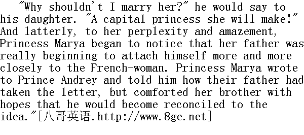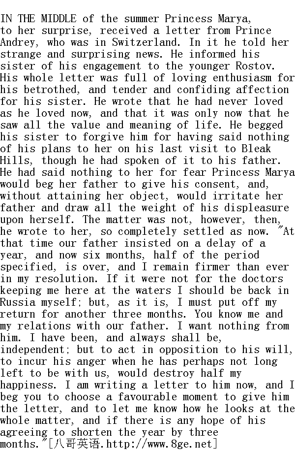 公爵小姐玛丽亚于仲夏接到安德烈公爵从瑞士寄来的一封意外的书信, 他在书信中通知她一则可怕的、出乎意料的消息。安德烈公爵宣布, 他和罗斯托娃订婚了。整封信都流露出他对未婚妻的爱情的喜悦和对妹妹的温情与信任。他写道, 他从来没有像现在这样爱恋, 他现在才懂得生活, 真正了解生活, 他请求妹妹原谅, 他到了童山, 没有把决定订婚的事告诉他妹妹, 虽然他向他父亲谈到这件事, 但他没有把这件事告诉她, 是因为她会请求父亲同意这门婚事, 假如达不到目的, 就会使得父亲恼怒, 父亲势必要向她发泄不满情绪, 她就得遭到严厉的责难。不过, 他写道, 那时候这件事还没有最后决定, 现在就不一样了。"那时候父亲给我一年的期限, 眼看过了六个月, 规定的期限满了一半, 我现在比任何时候都更坚定了。如果大夫们不把我留在这里采用矿泉水治疗, 我本人就到俄国去了, 可是现在我只得将归期再推迟三个月。你知道我, 也知道我和父亲之间的关系。我不需要他的什么东西, 我过去是, 现在是, 将来永远是不依附任何人的, 我们和他相处的时间也许不会太长了, 但是在这个时候做什么违背他的意旨的事情, 惹他发脾气, 势必会损害我的一半幸福。我现在给他写一封内容相同的信, 请你择定良机把信转交给他, 并且告诉我他对这件事的看法, 看看是否有希望, 要他同意把期限缩短三个月。" After long hesitations, doubts, and prayers, Princess Marya gave the letter to her father. The next day the old prince said to her calmly: 在长时间的犹豫、疑惑和祈祷以后, 公爵小姐玛丽亚把信交给父亲了。第二天老公爵心平气和地对她说: "Write to your brother to wait till I'm dead.... He won't have long to wait. I shall soon set him free."" 给哥哥写信, 在我未死之前, 要他等一等......时间不会太长了, 我很快给予他行动自由......" The princess tried to make some reply, but her father would not let her speak, and went on, getting louder and louder. "Let him marry, let him marry, the dear fellow.... A nice connection!... Clever people, eh? Rich, eh? Oh yes, a fine stepmother for Nikolushka she'll make! You write to him he can marry her to-morrow. Nikolushka shall have her for a stepmother, and I'll marry little Bourienne!... Ha, ha, ha, and so he shall have a stepmother too! Only there's one thing, I won't have any more women-folk about my house; he may marry and go and live by himself. Perhaps you'll go and live with him too?" He turned to Princess Marya: "You're welcome to, and good luck to you!" 公爵小姐心里想反驳什么, 可是父亲不让她开口, 他的嗓音越抬越高了。"结婚吧, 结婚吧, 亲爱的......是个好亲属!......都是聪明人, 是不是呢?富有的人, 是不是呢?是的, 尼古卢什卡有个好继母。给他写封信, 即使明天娶妻也行。她当尼古卢什卡的后娘, 我就来娶布里安!......哈, 哈, 哈, 他没有后娘也呆不下去啊!只是要当心一点, 我们家里不需要更多的妇女, 让他娶妻吧, 自个儿独立生活。也许你也迁到他那里去, 是吗?"他把脸转向公爵小姐玛丽亚, 说道: "愿上天保佑, 挨挨冻吧, 挨挨冻吧......挨挨冻吧!......" After this outburst the prince did not once allude to the subject again. But his repressed anger at his son's poor-spirited behaviour found a vent in his treatment of his daughter. He now added to his former subjects for jeering and annoying her a new one-allusions to a stepmother and gallantries to Mademoiselle Bourienne. 在这次发怒之后, 公爵一次也不再提这件事了。但因儿子的意志薄弱, 一种不露声色的懊丧在父女关系上显示出来了。在从前的嘲笑口实中, 又增添了一个新话题--关于继母关于向布里安小姐献殷勤的话题。