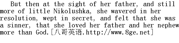 可是后来, 她看见了她的父亲, 尤其是看见了小科科, 她的意愿渐渐打消了, 她悄悄地哭着, 心里觉得她是个罪人, 她爱父亲和侄子, 尤甚于上帝。