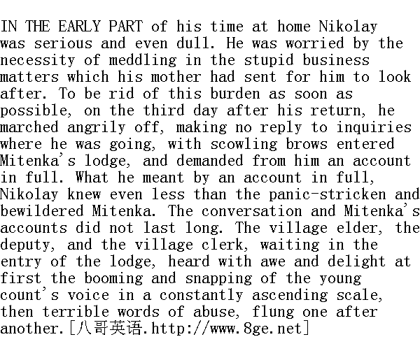 尼古拉回来以后, 初时他觉得心情沉重, 甚至很苦闷。使他心里难受的是, 他必须过问这些无聊的家务, 而母亲就是为了料理家务才把他召唤回来的。为了更快地卸下这个重担, 在他回到家中以后的第三天, 他就怒形于色, 问他上哪里去他也不回答, 他皱着眉头, 到耳房去看米坚卡, 叫他把全部帐目摆出来。全部帐目是些什么帐目, 胆战心惊的、困惑不安的米坚卡比尼古拉知道得更多。他和米坚卡的交谈、核查全部开销并没有延续很长的时间。在耳房的外间等候的村长、当选的代表和地方行政长官, 流露着恐惧而悦意的神态, 最初听见年轻伯爵的嗓音越提越高, 说话的声音叽叽喳喳, 喋喋不休, 然后听见一句紧接一句的可怕的咒骂。 "Robber! Ungrateful brute!...I'll thrash the dog!...not papa to deal with...plundering us..." and so on." 强盗啊!忘恩负义的坏蛋!......砍死这条狗......不跟爸爸那样......你偷光了......"等等骂人的话。 Then, with no less awe and delight, these persons saw the young count, with a red face and bloodshot eyes, dragging Mitenka out by the collar, kicking him with great dexterity at every appropriate moment between his words, and shouting:Away with you! Never let me set eyes on you, blackguard!" 然后这些人仍然带着喜悦和恐惧的样子看见年轻的伯爵面红耳赤, 眼睛里充血, 一把抓住米坚卡的后脖颈, 把他拖出来, 在咒骂之间, 他很轻巧地用腿和膝头顶住他的屁股, 用力推他往前走, 大声吆喝: "滚开, 坏蛋!你这个鬼家伙不要待在这儿吧!" Mitenka flew head first down six steps and ran to the shrubbery. This shrubbery was well known as a haven of refuge for delinquents at Otradnoe. Mitenka had, on coming home drunk from the town, himself hidden in the shrubbery, and many of the residents of Otradnoe had been indebted to the saving power of the shrubbery when anxious to conceal themselves from Mitenka. 米坚卡拼命地从六级台阶飞奔下来, 跑进了花坛。(这个花坛是奥特拉德诺耶的罪犯们所熟悉的避难的地方。那个喝得烂醉从城里走回来的米坚卡本人就是躲在这个花坛里的, 许多躲避米坚卡的奥特拉德诺耶的居民, 都熟谙这个花坛的庇护效力。) Mitenka's wife and sister-in-law, with frightened faces, peeped into the passage from the door of their room, where was a bright samovar boiling, and the bailiff's high bedstead stood under a quilted patchwork coverlet. 米坚卡的妻子和几个小姨子露出惶恐的神态从房门口探出身子向门斗张望, 一只精美的茶炊正在沸腾, 管事人的一张高床摆在那间房里, 床上铺着用那短短的碎布缝缀的、绗过的棉被。