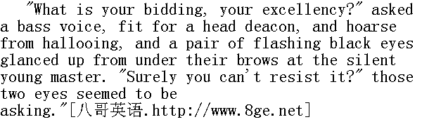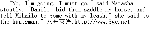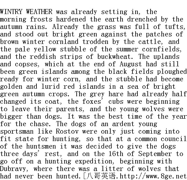 那时已是初寒时节, 早晨的严寒封住了被秋雨淋得乌黑油亮的土地, 秋播作物的幼苗长得茂盛, 一条条被牲口踩得变成褐色的越冬麦地、淡黄色的春播作物的麦庄和红色的荞麦地, 和那茂密的秋播作物分隔开来, 呈现着一片绿油油的颜色。八月底, 群山的顶峰和树林在秋播作物的黑土田地和麦庄之间犹如绿色的孤林, 这时在鲜绿的越冬作物中间, 已经变成金光闪闪的和鲜红的孤林。灰兔的毛已经落了一半(正在换毛), 一窝窝的小狐狸也开始向四面八方走去, 小豺狼已经长得比狗更大了。这是狩猎的最佳时节。热衷于狩猎的年轻猎人罗斯托夫的猎犬, 不仅长了膘, 而且获得了信任, 于是猎人全会上决定让猎犬休息三天, 九月十六日远行, 这次狩猎从橡树林开始, 因为林中有一个未被惊动的狼窝。 Such was the position of affairs on the 14th of September. 九月十四日的情况是这样的。 All that day the dogs were kept at home. It was keen and frosty weather, but towards evening the sky clouded over and it began to thaw. On the morning of the 15th of September when young Rostov in his dressing-gown looked out of window he saw a morning which was all the heart could desire for hunting. It looked as though the sky were melting, and without the slightest wind, sinking down upon the earth. The only movement in the air was the soft downward motion of microscopic drops of moisture or mist. The bare twigs in the garden were hung with transparent drops which dripped on to the freshly fallen leaves. The earth in the kitchen-garden had a gleaming, wet, black look like the centre of a poppy, and at a short distance away it melted off into the damp, dim veil of fog.Nikolay went out on to the wet and muddy steps. There was a smell of decaying leaves and dogs. The broad-backed, black and tan bitch Milka, with her big, prominent, black eyes, caught sight of her master, got up, stretched out her hindlegs, lay down like a hare, then suddenly jumped up and licked him right on his nose and moustache. Another harrier, catching sight of his master from the bright coloured path, arched its back, darted headlong to the steps, and, lifting its tail, rubbed itself against Nikolay's legs. 猎犬整天呆在家中, 天气很冷, 寒风刺骨, 但从傍晚起天空布满乌云, 暖和起来了。九月十五日清早, 年轻的罗斯托夫披上了一件长衫, 向窗外望望, 他一眼望见, 比这天早上更适宜于狩猎的天气是没有的了: 天空好像在融化, 风停了, 天幕向地面拉下来。在空气中移动的唯有尘雾或者是晨雾中悄悄落下的细微的水珠。花园中光秃秃的树枝上挂着透明的水珠。滴在刚刚落下的叶子上。菜园的土地犹如罂粟, 非常润湿, 变得更黑而有光泽, 在不远的距离以内, 和阴沉而潮湿的雾幕融成一片了。尼古拉走上被雨淋湿的污泥满地的台阶, 这里发散着枯萎的树木和猎犬的气味。那只黑腿的臀部宽大的母犬米尔卡, 睁开它那乌黑的凸出的大眼睛, 一看见主人便站起来, 向后伸了个懒腰, 像只灰兔似的躺在那里, 然后突然一跃而起, 对准他的鼻子和胡髭舔了一下。另外一只牡灵狸在花园中的一条小路上看见了主人, 把背弓起来, 向台阶飞也似的奔去, 它翘起尾巴, 开始蹭那尼古拉的腿。 "O, hoy!" He heard at that moment the inimitable hunting halloo which unites the deepest bass and the shrillest tenor notes. And round the corner came the huntsman and whipper-in, Danilo, a grey, wrinkled man, with his hair cropped round in the Ukrainian fashion. He held a bent whip in his hand, and his face had that expression of independence and scorn for everything in the world, which is only to be seen in huntsmen. He took off his Circassian cap to his master and looked scornfully at him. That scorn was not offensive to his master. Nikolay knew that this Danilo, disdainful of all, and superior to everything, was still his man and his huntsman." 好啊。"这时候可以听见无可模拟的猎人的呼唤声, 呼噜声中既含有最深沉的男低音, 又含有最尖细的男高音。猎犬训练管理人和狩猎长丹尼洛从墙角走出来了, 他头发苍白, 满面皱纹, 剪了个乌克兰式的童化头, 手里执着一根短柄长鞭, 流露出一副唯独猎人才有的独立活动和蔑视尘世中一切的表情。他在老爷面前摘下切尔克斯高顶帽, 鄙夷地向他望了一眼。他这种轻视的神情没有使老爷觉得受侮辱, 尼古拉晓得, 这个藐视一切的高踞于一切的丹尼洛, 毕竟是他的仆役和猎人。 "Danilo," said Nikolay, at the sight of this hunting weather, those dogs, and the huntsman, feeling shyly that he was being carried away by that irresistible sporting passion in which a man forgets all his previous intentions, like a man in love at the sight of his mistress." 丹尼洛!"尼古拉说, 畏葸地觉得, 在他看见这种狩猎的天气、这些猎犬和猎人时, 一种难以克服的狩猎的欲望支配着他, 就像一个钟情的男人在他的情妇面前竟会忘怀原有的各种打算一样。