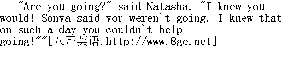 你要去吗?"娜塔莎说, "我还是知道!索尼娅说你们是去不成的。我晓得, 今天这样的日子非去不可了。" "Yes, we're going," Nikolay answered reluctantly. As he meant to attempt serious hunting he did not want to take Natasha and Petya. "We are going, but only wolf-hunting; it will be dull for you."" 我们要去了, "尼古拉不乐意地回答, 他打算认真地打一次猎, 今天他不想把娜塔莎和彼佳带在身边。"我们要去了, 可是要猎获的只是豺狼;你会感到枯燥无味的。" "You know that it's the greatest of my pleasures," said Natasha. "It's too bad-he's going himself, has ordered the horses out and not a word to us."" 你知道, 这是我的最大的乐趣, "娜塔莎说, "这很不妙, 他本人要去猎狼, 吩咐人家备马, 可是他不向我们吐露半句话。" "No hindrance bars a Russian's path!" declaimed Petya; "let's go!"" 俄国人不可阻挡, 我们去吧!"彼佳喊道。 "But you mustn't, you know; mamma said you were not to," said Nikolay to Natasha." 你本来就不能去, 妈妈不是说你不能去么。"尼古拉把脸转向娜塔莎说。