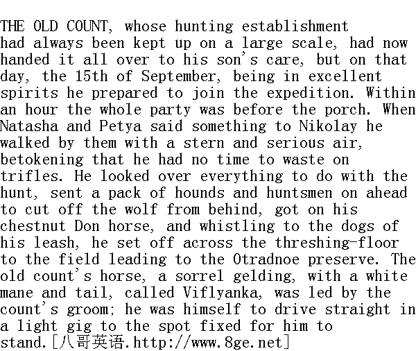 老伯爵一向经营大规模的狩猎业, 现今他把一切业务转交给儿子管理, 这一天, 九月十五号, 老伯爵快活起来, 也想亲自去狩猎。 过了一个钟头, 所有参加狩猎的人都来到台阶的近旁。尼古拉露出严肃认真的样子, 表示现在哪有闲工夫去料理琐碎的事, 娜塔莎与彼佳正在和他讲话, 他却顾不得这么许多, 便从他们身边走过去了。他把参加狩猎的各个小组察看了一遍, 先行派出一群猎犬和猎人前去围猎, 他就骑着一匹枣红色的顿河种马, 对他自己的一群猎犬打着唿哨, 经过打谷场, 向通往奥特拉德诺耶禁伐区的田野出发了。伯爵的马夫牵着老伯爵骑的一匹叫做维夫梁卡的白鬃白尾的枣红色骟马;他本人乘坐一辆轻便马车径直地向兽径驰去。 Fifty-four hounds were led out under the charge of six whippers-in and grooms. Of huntsmen, properly speaking, there were taking part in the hunt eight men besides the members of the family, and more than forty greyhounds ran behind them, so that with the hounds in leashes there were about a hundred and thirty dogs and twenty persons on horseback. 猎犬共计五十四头, 由六名猎犬训练管理人、看管猎犬的猎人带领。除开主人之外, 有八名灵狸看管人, 由他们带领四十多头灵狸, 这些灵狸连同主人的几群猎犬, 约计有一百三十头猎犬, 二十名骑马的猎人, 都朝着田野的方向出发。 Every dog knew its master and its call. Every man in the hunt knew his task, his place, and the part assigned him. As soon as they had passed beyond the fence, they all moved without noise or talk, lengthening out along the road and the field to the Otradnoe forest. 每只猎犬都认识主人, 知道自己的名字。每个猎人都知道自己应做的事情、围猎的地点和他所承担的任务。大伙儿刚刚走出菜园子, 就停止说话, 寂然无声, 有条不紊地、从容不迫地沿着通往奥特拉德诺耶森林的大道和田野拉长距离, 散开了。 The horses stepped over the field as over a soft carpet, splashing now and then into pools as they crossed the road. The foggy sky still seemed falling imperceptibly and regularly down on the earth; the air was still and warm, and there was no sound but now and then the whistle of a huntsman, the snort of a horse, the clack of a whip, or the whine of a dog who had dropped out of his place. When they had gone a verst, five more horsemen accompanied by dogs appeared out of the mist to meet the Rostovs. The foremost of them was a fresh, handsome old man with large, grey moustaches. 马群就像在毛皮地毯上行走那样, 沿着田野前进, 当它们走过大路时, 偶尔踩进了水洼, 发出啪嗒啪嗒的响声。雾霭弥漫的天空, 仍旧不知不觉地、不疾不徐地向地面拉下来;天空中一片沉寂, 而且和暖, 无声无息。有时可以听见猎人的唿哨声, 马的响鼻声, 或者是离开原地乱走的猎犬刺耳的吠声。当他们走了一俄里左右的时候, 有五个带着猎犬的骑士从那雾霭中出现, 他们向罗斯托夫的那帮猎人迎面走来。一位精力充沛、胡髭斑白、五官端正的老人在前面骑行。 "Good-day, uncle," said Nikolay as the old man rode up to him." 大叔, 您好。"当那老人驰近尼古拉时, 尼古拉说。