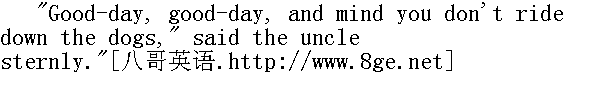 正当的事情, 走吧!......我本来就晓得。"大叔开腔了(这是罗斯托夫的远亲, 不富裕的邻人), 我本来就晓得, 你忍不住了, 你就去打猎, 好得很。正当的事情, 走吧!(这是大叔爱说的俗话。)你马上占领禁伐区, 其实我的吉尔奇克向我禀告了, 伊拉金一家带着一帮猎人盘踞在科尔尼克;正当的事情, 走吧!他们会从你们鼻子底下端走一窝狼仔的。" "That's where I'm going. Shall we join the packs?" asked Nikolay." 我也要到那里去, 怎么, 我们把猎犬合在一起吧?"尼古拉问道, "把猎犬合在一起......" The hounds were joined into one pack, and the uncle and Nikolay rode on side by side.Natasha, muffled up in a shawl which did not hide her eager face and shining eyes, galloped up to them, accompanied by Petya, who kept beside her, and Mihailo, the huntsman and groom, who had been told to look after her. Petya was laughing and switching and pulling his horse. Natasha sat her raven Arabtchick with grace and confidence and controlled him with an easy and steady hand. 他们把猎犬合成一大群了, 大叔和尼古拉并辔而行。娜塔莎骑马走到他们跟前, 她裹着头巾, 那张兴奋的脸孔、一对闪闪发亮的眼睛从头巾下面露出来了。彼佳、猎人米哈伊尔、保姆派来照应她的驯马师, 都不离寸步地陪伴着她。彼佳不知为什么而笑, 为什么鞭打自己的马, 不住地拉缰绳。娜塔莎熟练而自信地骑在一匹黑色的阿拉伯马上, 用一只可以信赖的手毫不费劲地把马勒住了。 The uncle looked with disapproval at Petya and Natasha. He did not like a mixture of frivolity with the serious business of the hunt. 大叔用不赞同的目光望了望彼佳和娜塔莎。他不喜欢把嬉戏和打猎这件严肃认真的事情混为一谈。 "Good-day, uncle; we're coming to the hunt too!" shouted Petya." 大叔, 您好, 我们也要走。"彼佳喊道。