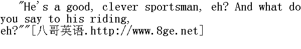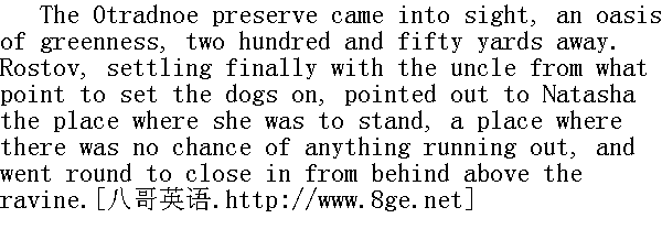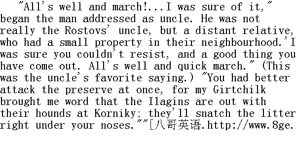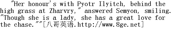 她和彼得·伊利奇(彼佳的尊称)站在扎罗夫草地附近。"谢苗微露笑容说。"也是女子, 打起猎来可很出色。" "And you wonder at her riding, Semyon,...eh?" said the count, "for a man even it wouldn't be amiss!"" 她骑起马来, 你会感到惊奇, 谢苗......怎样?"伯爵说, "即使是男人也不过如此!" "Who wouldn't wonder! So daring, so smart!"" 怎么不令人惊奇?非常勇敢, 非常灵活!" "And where's Nikolasha? Above the Lyadovsky upland, eh?" the count asked still in a whisper." 尼古拉沙(尼古拉的爱称)在哪儿?在利亚多夫斯克高地上吗?"伯爵用耳语问道。 "Yes, sir. His honour knows where he had best stand. He knows the ins and outs of hunting, so that Danilo and I are sometimes quite astonished at him," said Semyon, who knew how to please his master." 是的, 老爷。他知道他该呆在什么地方。他擅长骑马, 我和丹尼洛有时候也感到惊讶。"谢苗说, 他知道怎样才能使主人满意。