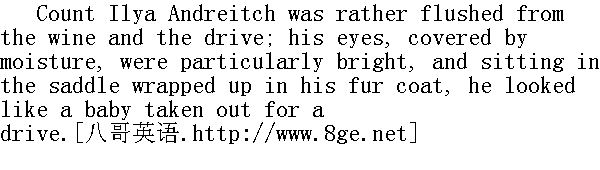伊利亚·安德烈伊奇由于骑马和饮酒已经有点脸红了, 他的眼睛蒙上薄薄一层湿气, 显得分外明亮, 他裹着一件皮袄, 骑在马鞍上, 那副样子就像打点他这个小孩去游逛似的。 After seeing after his duties, Tchekmar, with his thin face and sunken cheeks, looked towards his master, with whom he had lived on the best of terms for thirty years. Perceiving that he was in a genial humour, he anticipated a pleasant chat. A third person rode circumspectly-he had no doubt been cautioned-out of the wood, and stood still behind the count. This personage was a grey-bearded old man, wearing a woman's gown and a high, peaked cap. It was the buffoon, Nastasya Ivanovna. 那个消瘦的两颊深陷的切克马尔弄好了他自己的事情, 不住地瞅着主人, 他和主人和睦相处已有三十年了, 他明了主人的愉快心情, 等待他跟他愉快地谈话。还有个第三者(看来他是个有学问的人)从树林后面小心翼翼地走来, 他在伯爵后面停步。此人是个髯须斑白的老头, 他身穿女人的外衣, 头戴高顶帽, 这就是名叫纳斯塔西娅·伊万诺夫娜的侍从丑角。 "Well, Nastasya Ivanovna," whispered the count, winking at him, "you only scare off the game, and Danilo will give it you."" 喂, 纳斯塔西娅·伊万诺夫娜, "伯爵向他递了个眼色, 用耳语说, "你只会把野兽轰出洞来, 丹尼洛要给你个厉害瞧。" "I wasn't born yesterday," said Nastasya Ivanovna." 我本人......不比别人笨......"纳斯塔西娅·伊万诺夫娜说。 "Sh!" hissed the count, and he turned to Semyon. "Have you seen Natalya Ilyinitchna?" he asked Semyon. "Where is she?"" 嘘!"伯爵发出嘘嘘声后又把脸朝着谢苗。"你看见娜塔莉娅·伊利尼奇娜(娜塔莎的尊称)么?"他问谢苗。"她在哪里?"