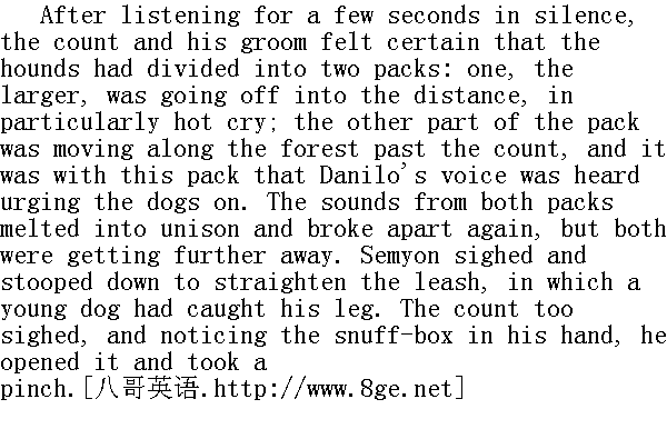 伯爵和他的马夫沉默地倾听几秒钟, 深信猎犬已分成两群, 其中一群为数较多, 嗥叫得特别厉害, 它们渐渐走开了;另一部分猎犬沿着森林从伯爵身旁疾驰起来, 在这群猎犬中可以听见丹尼洛催促猎犬抓住野兽的喊声。这两队猎人追捕野兽的喊声汇合起来, 抑扬婉转, 但是这两种喊声都渐渐离得远了。谢苗叹了一口气, 俯下身子把绊住小公犬的一条腿的皮带弄平, 伯爵也叹了一口气, 看见自己手中的鼻烟壶, 把它打开来, 掏出一撮鼻烟。 "Back!" cried Semyon to the dog, which had poked out beyond the bushes. The count started, and dropped the snuff-box. Nastasya Ivanovna got off his horse and began picking it up." 向后转!"谢苗对越过森林边沿的公犬喊了一声。伯爵颤抖了一下, 扔掉鼻烟壶。纳斯塔西娅·伊万诺夫娜翻身下马, 把鼻烟壶捡起来。 The count and Semyon watched him. All of a sudden, as so often happens, the sound of the hunt was in an instant close at hand, as though the baying dogs and Danilo's cries were just upon them. 伯爵和谢苗望着他。忽然间, 追赶野兽的喊声一刹那传到近边来了, 这是打猎时常有的情形, 仿佛吠叫的一张张狗嘴和丹尼洛催促猎狗抓住野兽的喊声快要在他们面前出现。 The count looked round, and on the right he saw Mitka, who was staring at the count with eyes starting out of his head. Lifting his cap, he pointed in front to the other side. 伯爵回头一望, 从右面望见米季卡, 米季卡瞪大眼睛瞧着伯爵, 举起他的帽子, 把另一侧的前方指给他看。 "Look out!" he shouted in a voice that showed the words had long been fretting him to be uttered. And letting go the dogs, he galloped towards the count." 你来卫护吧!"他喊叫起来, 那嗓音听来他憋了很久, 以致这个词不禁要脱口而出。他于是放出猎犬, 向伯爵那个方向疾驰去了。