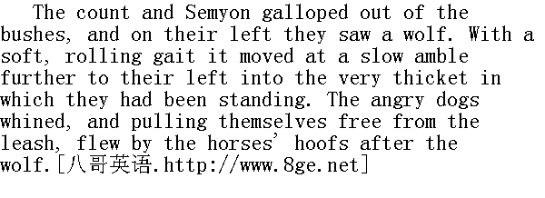伯爵和谢苗从森林边沿疾驰而出, 从左面望见一只狼, 这只狼有点儿摇摇晃晃, 悄悄地从他们左边跳到他们所站的森林边沿。几只凶恶的猎犬尖叫了一声, 挣脱了皮带, 从几匹马的脚旁向豺狼飞跑起来。 The wolf paused in his flight; awkwardly, like a man with a quinsy, he turned his heavy-browed head towards the dogs, and still with the same soft, rolling gait gave one bound and a second, and, waving its tail, disappeared into the bushes. At the same instant, with a cry like a wail, there sprang desperately out of the thicket opposite one hound, then a second and a third, and all the pack flew across the open ground towards the very spot where the wolf had vanished. The bushes were parted behind the dogs, and Danilo's brown horse, dark with sweat, emerged from them. On its long back Danilo sat perched up and swaying forward. He had no cap on his grey hair, that fluttered in disorder above his red, perspiring face. 狼暂时不跑了, 就像患了咽喉炎那样, 笨拙地把它那前额高的头转向猎犬, 仍然有点儿摇摇晃晃, 突然跳了一两下, 躲进森林边缘不见了。就在那个时刻有一只、又一只、第三只猎犬发出啼哭似的哀鸣惘然若失地从对面的森林边缘跳出来, 整整一群猎犬沿着田野, 沿着豺狼穿过(跑过)的地方跑起来了。紧随猎犬之后, 榛子灌木分开了, 丹尼洛那匹栗色的、由于出汗而变得乌黑的马出现了。丹尼洛没有戴帽子, 露出蓬乱的白发, 通红的脸上淌着热汗, 他缩作一团, 微微向前俯着身子, 骑在长长的马背上。 "Loo! loo! loo!..." he was shouting. When he caught sight of the count, there was a flash like lightning in his eyes." 我来呼唤猎犬抓住野兽, 我来呼唤猎犬抓住野兽!......"他喊道。当他看见伯爵的时候, 他的眼中闪出了电光。 "B-!" he shouted, using a brutally coarse term of abuse and menacing the count with his lifted whip. "Let the wolf slip!...sportsmen indeed!" And as though scorning to waste more words on the confused and frightened count, he lashed the moist and heavy sides of his brown gelding with all the fury that had been ready for the count, and flew off after the dogs. The count stood like a man who has been thrashed, looking about him and trying to smile and call for Semyon to sympathise with his plight. But Semyon was not there; he had galloped round to cut the wolf off from the forest. The greyhounds, too, were running to and fro on both sides. But the wolf got off into the bushes, and not one of the party succeeded in coming across him." 啊!......"他向伯爵举起短柄长鞭, 威吓道。"放走了狼啊!......什么猎人啊!"他好像没有跟局促不安的胆战心惊的伯爵交谈, 对伯爵怀恨在心, 用力鞭挞一下栗色骟马那凹陷的汗湿的肋部, 跟在猎犬后面疾驰去了。伯爵仿佛受到惩罚似的, 站立着, 向四下张望, 竭力地露出微笑, 藉以获得谢苗对他处境的怜惜。但是谢苗已经不在那里了;他骑马绕过灌木林, 截捕豺狼, 不让它走进森林中。灵狸看管人也从两旁拦截野兽, 但是这只狼经过灌木林走了, 没有一个猎人截住它。