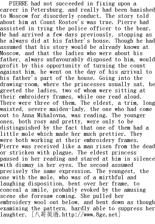 皮埃尔在彼得堡始终没有给自己选择一门职业, 他确因滋意闹事被驱逐到莫斯科去。有人在罗斯托夫家叙述的那则故事合乎事实。皮埃尔参与了一起捆绑警察分局局长和狗熊的案件。他在几天前才回来, 像平日一样, 呆在父亲住宅里。虽然他推想, 他的这段历史, 莫斯科已经家喻户晓。他父亲周围的那些太太一向对他不怀好意, 她们要借此机会使他父亲忿怒。但是在他抵达的那天, 他还是到他父亲的寓所去了。他走进公爵小姐平时驻足的客厅, 向用绷子绣花和读书(她们之中有一人正在朗读一本书)的几个小姐打招呼。她们共有三个人。年长的小姐素性好洁, 腰身太长, 面部表情过分严肃, 她就是到过安娜?米哈伊洛夫娜家里串门的姑娘, 她在朗读一本书;两个年幼的小姐脸颊粉红, 十分秀丽, 她们之间的差异只是其中一位唇上长着一点使她显得更为美丽的胎痣, 她们二人都用绷子绣花哩。她们会见皮埃尔, 把他看作死人或鼠疫病人。年长的公爵小姐中断了朗读, 默不做声地用恐惧的眼睛朝他瞟了一眼;那位年幼的公爵小姐, 脸上没有胎痣, 却流露出同样的表情;最年幼的小姐, 脸上长着一点胎痣, 天性活泼, 滑稽可笑, 她朝绷子弯下腰去, 藏起了笑意, 大概她已预见到即将演出一幕闹剧, 这使她觉得可笑。她把绒线向下扯, 弯下腰来, 好像在识别图案似的, 好不容易她才忍住没有笑出声来。 "Good morning, cousin," said Pierre. "You don't know me?" "Bomjour, macousine, " 皮埃尔说道, "VousnemereBconnaissezpas?"① ①法语: 表妹, 您好, 您不认识我了? "I know you only too well, only too well." " 我还记得很清楚, 很清楚。" "How is the count? Can I see him?" Pierre asked, awkwardly