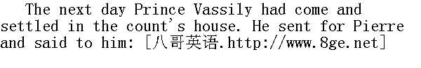 伯爵的健康情况怎样?我能会见他吗?"皮埃尔像平日那样不好意思地问道, 但并没有困窘不安。 "The count is suffering both physically and morally, and your only anxiety seems to be to occasion him as much suffering as possible." " 伯爵无论在身体上, 还是在精神上都遭受痛苦, 似乎您试图使他在精神上遭受更大的痛苦。" "Can I see the count?" repeated Pierre. " 我能会见伯爵吗?"皮埃尔重复自己说过的话。 "Hm ... if you want to kill him, to kill him outright, you can see him. Olga, go and see if uncle's broth is ready-it will soon be time for it," she added, to show Pierre they were busy, and busy in seeing after his father's comfort, while he was obviously only busy in causing him discomfort. " 嗯!......假如您想杀死他, 杀掉他, 那么您就能见他一面。奥莉加, 走去看看, 表叔喝的汤炖好了吗, 时候快到了。"她补充说道, 向皮埃尔表示, 她们都很忙, 正忙着安慰他父亲, 显然他只是忙着让他父亲心痛。 Olga went out. Pierre stood still a moment, looked at the sisters and bowing said: "Then I will go to my room. When I can see him, you will tell me." He went away and heard the ringing but not loud laugh of the sister with the mole behind him. 奥莉加走出去了。皮埃尔站了片刻, 望望那两个表妹, 鞠了一躬, 说道: "那我就到自己房里去好了。在能会面的时候, 就请你们告诉我吧。"他走出去了, 身后传来那个长有胎痣的表妹的洪亮悦耳、但却低沉的笑声。