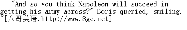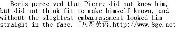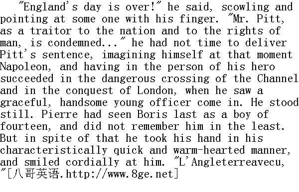 ①他皱起眉头, 用手指指着某人说道, "M.Pittcommetraitrealanationetaudroitdesgensestcondamnea..."②这时分他把自己想象为拿破仑本人, 并随同英雄经历危险越过加来海峡, 侵占了伦敦, 但他尚未说完处死皮特这句话时, 忽然看见一个身材匀称、面目俊秀、向他走来的青年军官。他停步了。皮埃尔离开鲍里斯时, 他才是个十四岁的男孩, 皮埃尔简直记不得他了, 尽管如此, 皮埃尔还是现出他所特有的敏捷而热情的样子, 一把握住鲍里斯的手, 脸上含着友善的微笑。 ①法语: 英国完蛋了。 ②法语: 皮特是个背叛民族、出卖民权的败类, 要判处...... "You remember me?" Boris said calmly with a pleasant smile. "I have come with my mother to see the count, but it seems he is not quite well." 您记得我吗?"鲍里斯面露愉快的微笑, 心平气和地说道, "我和我母亲来找伯爵, 可是他好像身体欠佳。" "Yes, he is ill, it seems. People are always bothering him," answered Pierre, trying to recall who this youth might be. " 是啊, 他好像身体欠佳。人家老是打扰他。"皮埃尔答道, 竭力地追忆这个年轻人到底是何人。