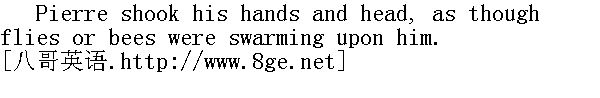 翌日, 瓦西里公爵来了, 他在伯爵家里落歇。他把皮埃尔喊到身边, 对他说道: "My dear fellow, if you behave here as you did at Petersburg, you will come to a very bad end; that's all I have to say to you. The count is very, very ill; you must not see him." "Moncher, sivousvousconduisezici, commeaPetersbeurg, vousfinireztresmal ;c'esttoutcequejevousdis, ②伯爵的病情很严重, 很严重;你根本用不着和他见面。" ②法语: 我亲爱的, 假如您在这里也像在彼得堡那样行为不正当, 结果会弄得很糟, 这是真话。 Since then Pierre had not been disturbed, and he spent the whole day alone in his room upstairs. 从那时起, 大家不再打扰皮埃尔了, 他孑然一人整天价呆在楼上自己房里。 At the moment when Boris came in, Pierre was walking up and down his room, stopping now and then in the corners, making menacing gestures at the wall, as though thrusting some invisible enemy through with a lance, then he gazed sternly over his spectacles, then pacing up and down again, murmuring indistinct words, shrugging his shoulders and gesticulating. 当鲍里斯向皮埃尔房里走进来时, 他正在房里来回踱方步, 有时候在屋角里停步不前, 对着墙壁做出威胁的手势, 仿佛用长剑刺杀那看不见的敌人似的, 他板起脸孔从眼镜上方向外张望, 然后又开始踱来踱去, 有时候口里喃喃地说着不清晰的话语, 他耸耸肩, 摊开两手。