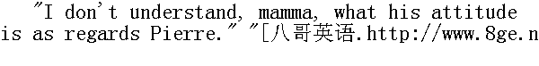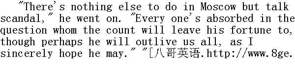 妈妈, 我不明白, 他对皮埃尔的态度怎样?"儿子问道。 "The will will make all that plain, my dear; our fate, too, hangs upon it...."" 遗嘱将说明一切, 我的亲人, 我们的命运以它为转移......" "But what makes you think he will leave us anything?" " 可是您为什么认为, 他会把点什么东西留给我们呢?" "Oh, my dear! He is so rich, and we are so poor." " 唉, 我的朋友!他那么富有, 可我们却这么穷!" "Well, that's hardly a sufficient reason, mamma." " 嘿, 妈妈, 这还不是充分的理由啊。"