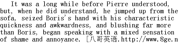 皮埃尔久久地不能明白, 但是当他明白了, 他就从沙发上飞快跳起来, 以他那固有的敏捷而笨拙的动作一把托住了鲍里斯的手臂;这时分他比鲍里斯的脸红得厉害多了, 满怀着又羞愧又懊悔的感情说起话来: "Well, this is strange! Do you suppose I ... how you could think ... I know very well ..."" 这多么古怪!我难道......可谁又会去想呢?......我十分清楚......" But Boris again interrupted him. 可是鲍里斯又把他的话打断了: "I am glad I have told you everything frankly. Perhaps you dislike it: you must excuse me," he said, trying to put Pierre at his ease instead of being put at his ease by him; "but I hope I have not offended you. I make it a rule to say everything quite plainly.... Then what message am I to take? You will come to dinner at the Rostovs'?" And Boris, with an evident sense of having discharged an onerous duty, having extricated himself from an awkward position, and put somebody else into one became perfectly pleasant again. " 我把话全部说出来了, 我觉得非常高兴。您也许会不乐意, 就请您原谅我吧。"他说道, 不仅不让皮埃尔安慰他, 他反而安慰皮埃尔, "但是我希望, 我不会使您受到屈辱。我的规矩是坦率地把话说干净......我应该怎样转达呢?您去罗斯托夫家吃午饭吗?"鲍里斯显然推卸了沉重的责任, 自己摆脱了尴尬的处境, 却又使别人处于那种境地, 于是他又变得非常愉快了。 "No, let me tell you," said Pierre, regaining his composure, "you are a wonderful person. What you have just said was very fine, very fine. Of course you don't know me, it's so long since we've seen each other ... we were children.... You might suppose I should ... I understand, I quite understand. I shouldn't have done it, I shouldn't have had the courage, but it's splendid. I'm very glad I have made your acquaintance. A queer idea," he added, pausing and smiling, "you must have had of me." He laughed. "But what of it? Let us know each other better, please!" He pressed Boris's hand. "Do you know I've not once seen the count? He has not sent for me ... I am sorry for him, as a man ... But what can one do?" " 不, 请您听我说吧, "皮埃尔心平气和地说道, "您是个不平凡的人。您方才说的话很不错, 很不错。不消说, 您不认识我了。我们许久不见面了......那时候还是儿童呢......您可以把我推测一番......我心里明白, 十分明白。如果我缺乏勇气, 这件事我就办不成啊, 可是这棒极了。我和您认识了, 我觉得非常高兴。说来真奇怪, "他沉默片刻, 面露微笑地补充了一句, "您把我推测成什么样子!"他笑了起来。"也罢, 这没有什么, 那怎样呢?我们以后会认识得更加透彻的。就这样吧。"他握握鲍里斯的手。"您是否知道, 伯爵那儿我一次也没有去过哩。他没邀请我......我怜悯他这个人......可是有什么法子呢?"