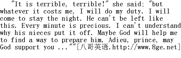 这多么可怕!多么可怕!"她说道, "无论我花费多大的代价, 我也要履行自己的义务。我准来过夜。不能就这样丢下他不管。每瞬间都很宝贵啊。我真不明白, 公爵小姐们干嘛要磨磨蹭蹭。也许上帝会帮助我想出办法来给他准备后事......Adieu, monprince, quelebonDieuvoussoutienne......"① ①法语: 公爵, 再见吧, 但愿上帝保佑您...... "Adieu, my kind friend," answered Prince Vassily, turning away from her. "Adieu, mabonne, " ②瓦西里公爵答道, 一面转过脸去避开她。 ②法语: 我亲爱的, 再见吧。 "Oh, he is in an awful position!" said the mother to her son, when they were sitting in the carriage again. "He scarcely knows any one." " 唉, 他的病势很严重, 糟糕透了, "当母亲和儿子又坐上四轮轿式马车时, 母亲对儿子说道, "他几乎什么人也认不得了。"