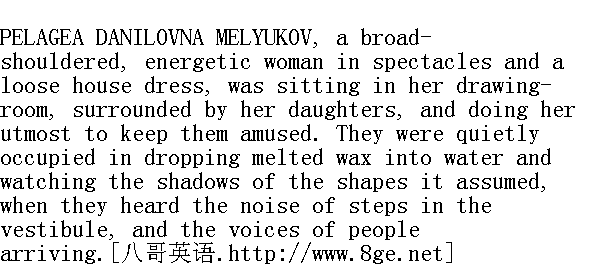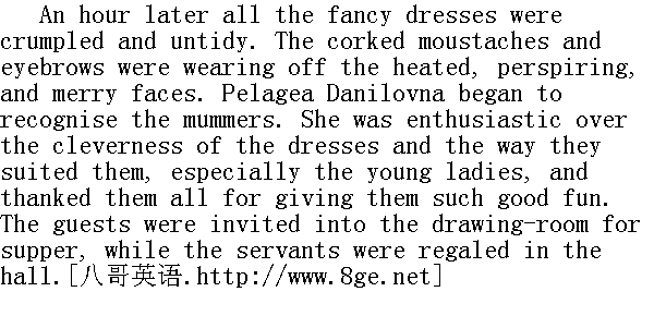 佩拉格娅·丹尼洛夫娜·梅柳科娃是一个敦实的、精力充沛的女人, 戴一副眼镜, 穿一件对襟无扣的宽大的连衣裙, 坐在客厅中, 几个女儿围在她身边, 她想方设法不使她们感到烦闷。她们正在慢慢地倒出蜡烛油, 当接待室传来一些来客的步履声和说话声的时候, 她们就望着几个走出去的人影。 The hussars, fine ladies, witches, clowns, and bears, coughing and rubbing the hoar-frost off their faces, came into the hall, where they were hurriedly lighting candles. The clown-Dimmler-and the old lady-Nikolay-opened the dance. Surrounded by the shrieking children, the mummers hid their faces, and disguising their voices, bowed to their hostess and dispersed about the room. 化装成骠骑兵、太太、巫婆、丑角、狗熊的人在接待室里咳嗽几声, 清清嗓子, 擦干净挂了霜的面孔, 然后进入人们急急忙忙地点燃蜡烛的大厅。化装成丑角的季姆勒和化装成太太的尼古拉首先跳起舞来。那些被乱喊乱叫的儿童围住的化装的人, 蒙着脸, 改变了嗓子, 在女主人面前鞠躬行礼, 然后在房里叉开腿站着。 "Oh, there's no recognising them. And Natasha! See what she looks like! Really, she reminds me of some one. How good Edward Karlitch is! I didn't know him. And how he dances! Oh, my goodness, and here's a Circassian too, upon my word; how it suits Sonyushka! And who's this? Well, you have brought us some fun! Take away the tables, Nikita Vanya. And we were sitting so quiet and dull!"" 啊, 没法认出来!是娜塔莎么!你们瞧, 她像谁啊!说真的, 像个什么人。爱德华·卡尔雷奇多么清秀啊!我认不出来。他跳得真棒!啊, 我的爷呀!切尔克斯人扮得出色, 说真的, 索纽什卡扮这个角色多么合适。这又是什么人啊?唔, 令人高兴!尼基塔, 万尼亚, 把这些桌子挪开。我们还安闲地坐着哩!" "Ha-ha-he!...The hussar, the hussar! Just like a boy; and the legs!...I can't look at him,..." voices cried." 哈--哈--哈!......骠骑兵, 骠骑兵啊!她真像个男孩子, 看看那双脚!......我看不清晰......"可以听见许多人的说话声。 Natasha, the favourite of the young Melyukovs, disappeared with them into rooms at the back of the house, and burnt cork and various dressing-gowns and masculine garments were sent for and taken from the footman by bare, girlish arms through the crack of the half-open door. In ten minutes all the younger members of the Melyukov family reappeared in fancy dresses too. 娜塔莎, 梅柳科娃家里的年轻人最喜爱的人, 和他们一同溜进那后面的房间里去了, 在这里, 几个少女的裸露的手从那敞开的门里接过一名男仆递来的她们所必需的软木炭、各种各样的长衫和男人的服装。过了十分钟, 梅柳科娃家里的年轻人便和化了装的人们汇合在一起了。