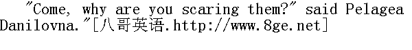 唔, 怎么要吓唬她们啊!"佩拉格娅·丹尼洛夫娜说道。 "Why, mamma, you tried your fate yourself..." said her daughter." 妈妈, 要知道您自己也占卜过......"女儿说。 "And how do they try fate in a granary?" asked Sonya." 在粮仓里怎样占卜呢?"索尼娅问道。 "Why, at a time like this they go to the granary and listen. And according to what you hear,-if there's a knocking and a tapping, it's bad; but if there's a sound of sifting corn, it is good. But sometimes it happens..."" 最好是现在就到粮仓里去, 听听那里的响声。若是听到敲打得咚咚响, 就是凶兆, 若是听到装谷的响声, 就是吉兆, 否则就是......" "Mamma, tell us what happened to you in the granary?"" 妈妈, 告诉我, 您在粮仓里遇到了什么?"