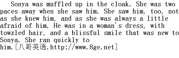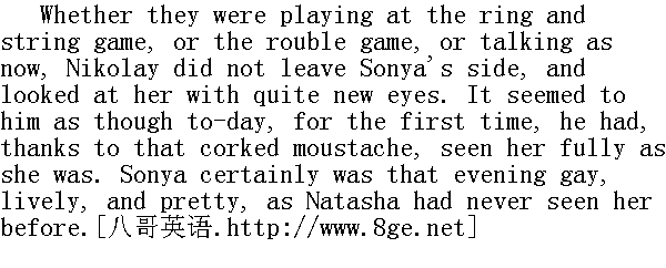 无论是做戒指游戏、做绳子游戏, 或者做卢布游戏, 还是像此刻这样聊天, 尼古拉都未曾离开索尼娅身边, 他用迥然不同的新眼光看待她。他好像觉得, 多亏这副软木炭画的胡子, 今天他才首次充分地认识她了。这天晚上索尼娅的确相当快乐、活泼而且漂亮, 尼古拉从未看见她有过这副模样。 "So, this is what she is, and what a fool I have been!" he kept thinking, looking at her sparkling eyes, at the happy, ecstatic smile dimpling her cheeks under the moustache. He had never seen that smile before." 瞧, 她多么漂亮, 可是我却是个笨蛋!"他一面想道, 一面望着她那闪闪发亮的眼睛和显得幸福的得意的微笑, 这一笑使那胡子下面的面颊现出了一对酒靥。 "I'm not afraid of anything," said Sonya. "May I go at once?" She got up. They told Sonya where the granary was; how she was to stand quite silent and listen, and they gave her a cloak. She threw it over her head and glanced at Nikolay." 我什么也不怕, "索尼娅说, "可以立刻去吗?"她站起来。旁人告诉她, 粮仓在什么地方, 她应当站在那儿谛听, 然后就把一件皮袄递给她。她把皮袄披在头上, 向尼古拉望了一眼。 "How exquisite that girl is!" he thought. "And what have I been thinking about all this time?"" 这个少女多么迷人!"他想了想。"到眼前为止我一直在想什么啊!" Sonya went out into the corridor to go to the granary. Nikolay hastily went out to the front porch, saying he was too hot. It certainly was stuffy indoors from the crowd of people. 索尼娅走到通往粮仓的走廊上, 尼古拉说他觉得很热, 急忙向正门庭阶走去。这幢屋子里挤满了人, 的确十分闷热。