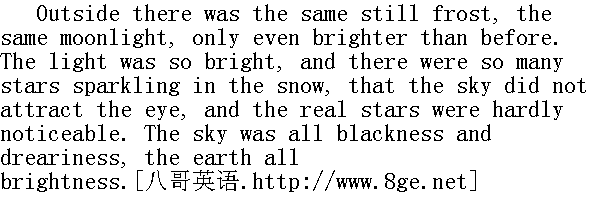 户外仍然是停滞不动的寒气, 仍然是一轮皓月, 只是显得更加明亮罢了。光线是那么强, 雪地上的星星是那么繁多, 直教人不想抬头去仰望夜空。真正的星星反而不太显眼。天空里一片昏暗, 异常寂寞, 而地球之上则分外欢乐。 "I'm a fool; a fool! What have I been waiting for all this time?" thought Nikolay; and running out into the porch he went round the corner of the house along the path leading to the back door. He knew Sonya would come that way. Half-way there was a pile of logs of wood, seven feet long. It was covered with snow and cast a shadow. Across it and on one side of it there fell on the snow and the path a network of shadows from the bare old lime-trees. The wall and roof of the granary glittered in the moonlight, as though hewn out of some precious stone. There was the sound of the snapping of wood in the garden, and all was perfect stillness again. The lungs seemed breathing in, not air, but a sort of ever-youthful power and joy." 我是笨蛋, 一个笨蛋!我直至目前还在等待着什么?"尼古拉想了想, 他跑步走到正门庭阶上, 沿着一条通往后门庭阶的小经绕过了屋角。他晓得索尼娅会到这里来。数立方俄丈的垛起来的木柴摆放在道路中间, 被积雪覆盖着, 可以看见木柴的影子, 光秃秃的老菩提树的阴影交错在一起, 它超过木柴并从侧面投射在积雪和小径上。这条小径通往粮仓。原木造的粮仓的墙壁和被积雪覆盖着的屋顶就像是用宝石凿出来的, 在目光下熠熠生辉。花园里的一颗树喀嚓响了一声, 后又鸦雀无声了。心胸呼吸的仿佛不是空气, 而是永恒的青春的活力和喜悦。 From the maid-servants' entrance came the tap of feet on the steps; there was a ringing crunch on the last step where the snow was heaped, and the voice of the old maid said: 女仆住房前面的台阶上响起了咯吱咯吱的步履声, 被积雪覆盖的最后一级阶梯上发出响亮的回声, 可以听见老处女的说话声: "Straight on, along this path, miss. Only don't look round!"" 一直向前走, 沿着这条小径一直向前走, 小姐, 只不过别回头望!" "I'm not afraid," answered Sonya's voice, and Sonya's little feet in their dancing-shoes came with a ringing, crunching sound along the path towards Nikolay." 我不怕。"可以听见索尼娅回答的声音, 她沿着一条朝向尼古拉身边的小径走来, 她那穿着精致的短靿皮鞋的小脚, 踩在地上发出咯吱咯吱的响声。
