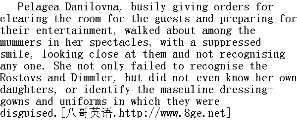 佩拉格娅·丹尼洛夫娜吩咐给客人空出地方来, 宴请主人和仆人, 她没有取下眼镜, 忍住笑, 在那些化装的人们中间来回地走着, 凑近他们, 谛视他们的面孔, 一个人也不认识。她非但不认识罗斯托夫家里的人和季姆勒, 怎么也认不出她自己的几个女儿, 怎么也认不出她们穿的她丈夫的几种长衫和制服。 "And who is this?" she kept saying, addressing her governess and gazing into the face of her own daughter disguised as a Tatar of Kazan. "One of the Rostovs, I fancy. And you, my hussar, what regiment are you in, pray?" she asked Natasha. "Give the Turk a preserved fruit," she said to the footman carrying round refreshments; "that's not forbidden by his law."" 这是谁的什么人呀?"她仔细望着化装成喀山鞑靼人的她的女儿的面孔, 一面把脸转向家庭女教师, 说道。"看来好像是罗斯托夫家里的什么人。喂, 骠骑兵先生, 您在什么兵团服役呢?"她问娜塔莎。"给土耳其人一点果子软糕吧。"她对那个拿着食品绕行一周的小吃部管事说, "他们的规矩不禁止吃这种食品。" Sometimes, looking at the strange and ludicrous capers cut by the dancers, who, having made up their minds once for all that no one recognised them, were quite free from shyness, Pelagea Danilovna hid her face in her handkerchief, and all her portly person shook with irrepressible, good-natured, elderly laughter. 有时候佩拉格娅·丹尼洛夫娜望着这些跳舞的人, 他们断然地认为只要化了装, 谁也认不出他们。因此不觉得害羞;看见他们跳出古怪而且滑稽可笑的舞步时, 她就用手绢蒙着脸, 因为她这个慈祥的老太婆忍不住, 笑出声来, 所以她整个肥胖的身子不住地颤抖。 "My Sashinette, my Sashinette!" she said." 我的小萨沙, 小萨沙!"她说。 After Russian dances and songs in chorus, Pelagea Danilovna made all the party, servants and gentry alike, join in one large circle. They brought in a string, a ring, and a silver rouble, and began playing games. 在跳完俄罗斯舞和轮舞以后, 佩拉格娅·丹尼洛夫娜让所有的仆人和主人聚在一起, 围成一个大圈子, 拿来了一枚戒指、一根绳子和一个卢布, 做各种集体游戏。