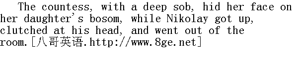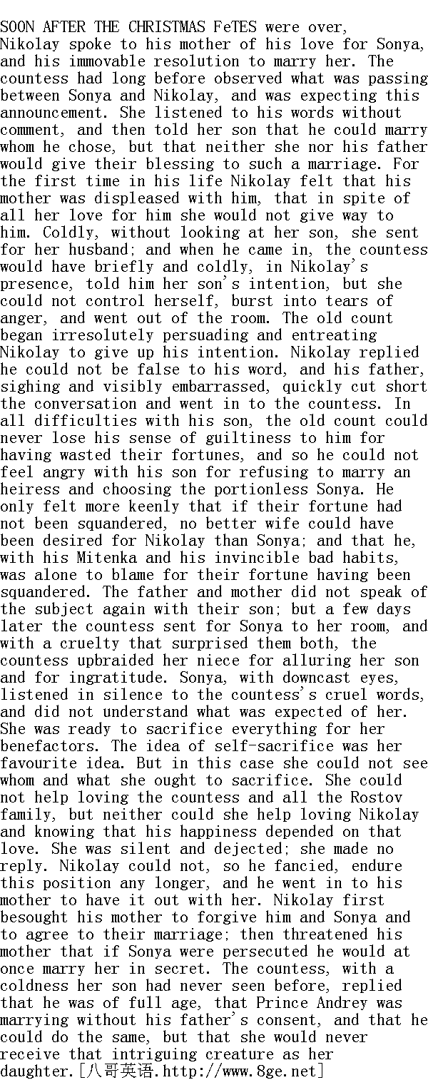 圣诞节节期之后不久, 尼古拉告诉母亲他钟爱索尼娅并且向她表白他将娶她为妻的决心。伯爵夫人早就发觉索尼娅和尼古拉之间发生的爱情, 而且预料到他会吐露衷肠, 因此她默不作声地听他说话, 并且对她儿子说, 他想和谁结婚就可以和谁结婚, 不过无论是她还是父亲对这种婚事决不会为他祝福。尼古拉首次感到, 母亲对他不满意, 尽管她十分爱他, 她也决不会向他让步。她态度冷淡, 不朝儿子望上一眼, 就派人去把她丈夫找来, 当他来到后, 伯爵夫人想在儿子面前简短地冷静地告诉丈夫是怎么回事, 但她忍不住, 懊恼得痛哭流涕并从房里走出去了。老伯爵开始犹豫不决地规劝尼古拉, 想使他感到内疚, 要他放弃自己的打算。尼古拉回答, 说他决不能违背自己的诺言, 于是父亲叹了一口气, 看来他感到困惑不安, 很快就停止讲话, 到伯爵夫人那里去了。虽然他和儿子争吵, 但是他常常意识到, 他的事业受到挫折, 因而在男儿面前犯有过错, 儿子拒绝娶那个有钱的未婚女子, 而挑选没有嫁妆的索尼娅, 他不能因为此事而对他儿子表示忿懑, --只有这时他才更加鲜明地想到, 如果不是事业受到挫折, 对尼古拉来说, 决不能指望找到一个比索尼娅更好的妻子, 事业受到挫折只能归罪于他和他的米坚卡, 还有他那不可克服的习惯势力。 父亲和母亲不再向儿子谈论这件事, 在这之后过了几天, 伯爵夫人把索尼娅喊到身边, 显现出她们二人都意料不到的残酷无情的样子, 狠狠地责备外甥女引诱她儿子, 责备她忘恩负义。索尼娅默默无言, 低垂着眼帘, 谛听伯爵夫人的残酷的话语, 她不明白到底对她有什么要求。她愿意为恩人们牺牲一切。自我献身的思想是她珍爱的思想, 但是在这种情况下, 她没法明了, 她应当为谁作出什么牺牲。她不能不爱伯爵夫人和罗斯托夫全家人, 但是她也不能不爱尼古拉, 她没法知道她的幸福取决于这种爱情。她默默无言, 怏怏不乐, 没有回答她的话。尼古拉仿佛觉得, 他再也不能忍受这种情状, 他于是去向母亲表白一番。尼古拉时而央求母亲宽恕他和索尼娅, 答应他们结婚, 时而威吓母亲, 并且宣称, 如果有人迫害索尼娅, 他就要马上秘密和她结婚。伯爵夫人带着他从未见过的冷淡的表情回答他的话, 说他是个成年人, 并说安德烈公爵未经他父亲同意贸然结婚了, 他可以如法泡制, 但她永远也不会承认这个女阴谋家是自己的女儿。 Stung to fury by the words "intriguing creature," Nikolay, raising his voice, told his mother that he had never expected her to try and force him to tell his feelings, and that since it was so, then for the last time he ... But he had not time to utter the fatal word, which his mother seemed, from her expression, to be awaiting in terror, and which would, perhaps, have remained a cruel memory between them for ever. He had not time to finish, because Natasha, who had been listening at the door, ran into the room with a pale and set face. 女阴谋家这个词触怒了尼古拉, 他抬高嗓门对母亲说, 他从未想过她竟然强迫他出卖自己的感情, 如果是这样, 那么他就要最后一次说......但是他还来不及说出这句果断的话, 母亲就凭他的面部表情看出他要说这句话, 她惊惶失措地等待他开口, 这句话也许永远成为他们之间的沉痛的回忆。他来不及把话说完, 因为娜塔莎在门边偷听到了, 她脸色苍白, 神态严肃, 从门口走进房里来。 "Nikolenka, you are talking nonsense; hush, hush, hush! I tell you hush!" ... she almost screamed to overpower his voice." 尼古连卡。你在说废话, 住嘴吧, 住嘴吧!我对你说, 住嘴吧!......"为了压住他的声音, 她几乎在叫喊。 "Mamma, darling, it's not at all so ... my sweet, poor darling," she said, turning to her mother, who gazed in terror at her son, feeling herself on the edge of an abyss; but in the obstinacy and heat of the conflict unwilling and unable to give in. "Nikolenka, I'll explain to you; you go away-listen, mamma, darling," she said to her mother." 亲爱的, 妈妈, 这根本不是由于......我的心肝, 可怜的妈妈, "她向妈妈转过脸来, 妈妈觉得她自己濒临于痛苦, 处于决裂的边缘, 恐惧地望着儿子, 但因她执拗, 残酷斗争, 所以她不想, 也不能退让。"尼古连卡, 我给你讲讲清楚, 你走开--亲爱的妈妈, 您听我说吧。"她对母亲说。 Her words were incoherent, but they attained the effect at which she was aiming. 她说的话毫无意义, 但是得到了她渴望得到的结果。
