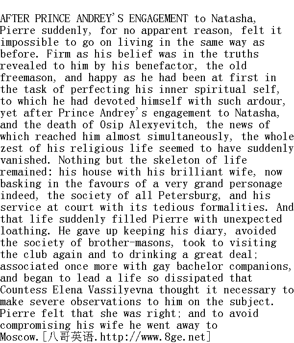 安德烈公爵在求娜塔莎为妻之后, 皮埃尔并无任何明显的理由, 忽然觉得不能继续过着从前的生活。无论他怎样相信他的恩主向他启示的真理, 无论他怎样充满热情为之献身的内心修炼在开初使他心向神往的时日给予他多大的喜悦, --在安德烈公爵和娜塔莎订婚之后, 在约瑟夫·阿列克谢耶维奇死去之后(他几乎是同时获悉这两件事), 从前的生活魅力对他来说忽已消失殆尽。生活只留下一个框架: 他的那幢住宅、一个姿色迷人的妻子--她现已获得某个要人的宠爱、他和彼得堡一切人士的结识以及枯燥乏味的、拘泥于形式的业务。皮埃尔忽然觉得从前的那种生活出乎意外地令人讨厌。他停止写日记了, 避免与师兄师弟来往, 又开始进入俱乐部, 开始好酒贪杯, 又与光棍朋友接近, 他开始过着这种生活, 以致伯爵夫人海伦·尼西里耶夫娜认为有必要对他严加指责。皮埃尔觉得她的做法是对的, 为了不使她声名狼藉、皮埃尔动身前往莫斯科。 In Moscow, as soon as he entered his huge house with the faded and fading princesses, his cousins, and the immense retinue of servants, as soon as, driving through the town, he saw the Iversky chapel with the lights of innumerable candles before the golden setting of the Madonna, the square of the Kremlin with its untrodden snow, the sledge-drivers, and the hovels of Sivtsev Vrazhok; saw the old Moscow gentlemen quietly going on with their daily round, without hurry or desire of change; saw the old Moscow ladies, the Moscow balls, and the English Club-he felt himself at home, in a quiet haven of rest. In Moscow he felt comfortable, warm, at home, and snugly dirty, as in an old dressing-gown. 在莫斯科, 他一走进他那栋高古的住宅(它里面住着已经憔悴和正在憔悴的公爵小姐及许多家仆)的时候, 在他驶过全城, 刚刚看见那金镂袈裟前面的无数烛光的伊韦尔小教堂, 看见那积雪未被车子压脏的克里姆林广场, 看见西夫采夫·弗拉若克贫民区的马车夫和茅舍的时候, 在他一看见那些无所希冀、足不出户地虚度残生的莫斯科老人的时候, 在他一看见那些老太太, 那些莫斯科的太太小姐、莫斯科的芭蕾舞和莫斯科的英国俱乐部的时候, --他就觉得自己置身于家中, 置身于平静的安身之处。在莫斯科定居, 就像穿着一种旧长衫似的, 温暖、舒适、不干净。 All Moscow society, from the old ladies to the children, welcomed Pierre back like a long-expected guest, whose place was always ready for him, and had never been filled up. For the Moscow world, Pierre was the most delightful, kind-hearted, intellectual, good-humoured, and generous eccentric, and a heedless and genial Russian gentleman of the good old school. His purse was always empty, because it was always open to every one. 整个莫斯科的上流社会, 从老太太到小孩, 迎接皮埃尔就像迎接一位翘盼已久的尸位以待的客人那样。在莫斯科的上流社会人士的心目中, 皮埃尔是个至为可爱、仁慈聪颖、愉快、宽宏大量的古怪人, 是个心不在焉的诚实待人的旧派头的俄国贵族。他的钱包总是空的, 因为它对人人都是敞开着的。 Benefit-entertainments, poor pictures and statues, benevolent societies, gypsy choruses, schools, subscription dinners, drinking parties, the masons, churches, and books-no one and nothing ever met with a refusal, and had it not been for two friends, who had borrowed large sums of money from Pierre and constituted themselves guardians of a sort over him, he would have parted with everything. Not a dinner, not a soiree took place at the club without him.As soon as he was lolling in his place on the sofa, after a couple of bottles of Margaux, he was surrounded by a circle of friends, and arguments, disputes, and jokes sprang up round him. Where there were quarrels, his kindly smile and casually uttered jokes were enough to reconcile the antagonists. The masonic dining lodges were dull and dreary when he was absent. 纪念演出、劣等彩色画、塑像、慈善团体、茨冈人、学校、募捐宴会、纵酒、共济会、教会、书籍--任何人、任何事都不会遭到他的拒绝;假如不是有两个向他借了许多钱的友人担任监护的话, 他真会把什么都分给别人。俱乐部里, 无论是宴会, 还是晚会, 少不了他。他一喝完两瓶马尔高酒, 随便倒在他坐的沙发上, 人们就把他围住, 议论纷纷, 争吵不休, 笑话喧阗。无论在那里发生争吵, 只要他露出和善的微笑, 随便打个诨, 就和事了。共济会分会的餐厅里假如缺少他, 就显得烦闷, 很不景气。 When after a bachelor supper, with a weak and good-natured smile, he yielded to the entreaties of the festive party that he would drive off with them to share their revels, there were shouts of delight and triumph. At balls he danced if there were a lack of partners. Girls and young married ladies liked him, because he paid no special attention to any one, but was equally amiable to all, especially after supper. "He is charming; he is of no sex," they used to say of him. 单身汉的晚餐结束之后, 他带着和善而甜蜜的微笑, 屈从愉快的伙伴的请求, 站立起来, 和他们一同驶行, 于是在青年人之间传来了激动的欢呼。如果舞会上缺少一个舞伴, 他就走来跳舞。年轻的夫人和小姐之所以喜欢他, 是因为他不追求任何女人, 他对人人都同样殷勤, 特别是在晚餐完毕后: Il est charmant, il n'a pas de sexe.①"大家都这样谈论他。 Pierre was just a kammerherr, retired to end his days in Moscow, like hundreds of others. How horrified he would have been if, seven years before, when he had just come home from abroad, any one had told him that there was no need for him to look abou