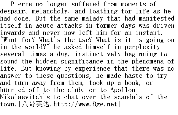 皮埃尔不像从前那样每时每刻都感到绝望、忧郁而且厌恶人生, 过去经常急剧地发作的疾病已侵入内心, 每时每刻都在缠住他。"为什么?为了什么目的?这个世界上在发生什么事?"在一日之内他就有几次惶惑不安地问自己, 情不自禁地开始缜密思考生活中的各种现象的涵义, 但他凭经验也知道, 这些问题都没有答案, 于是他赶紧设法回避它, 他时常看书, 或者赶着上俱乐部, 或者到阿波隆·尼古拉耶维奇那里去闲谈市内的流言飞语。 "Elena Vassilyevna, who has never cared for anything but her own body, and is one of the stupidest women in the world," Pierre thought, "is regarded by people as the acme of wit and refinement, and is the object of their homage. Napoleon Bonaparte was despised by every one while he was really great, and since he became a pitiful buffoon the Emperor Francis seeks to offer him his daughter in an illegal marriage. The Spaniards, through their Catholic Church, return thanks to God for their victory over the French on the 14th of June, and the French, through the same Catholic Church, return thanks to God for their victory over the Spaniards on the same 14th of June. My masonic brothers swear in blood that they are ready to sacrifice all for their neighbour, but they don't give as much as one rouble to the collections for the poor, and they intrigue between Astraea and the manna-seekers, and are in a ferment about the authentic Scottish rug, and an act, of which the man who wrote it did not know the meaning and no one has any need. We all profess the Christian law of forgiveness of sins and love for one's neighbour-the law, in honour of which we have raised forty times forty churches in Moscow-but yesterday we knouted to death a deserter; and the minister of that same law of love and forgiveness, the priest, gave the soldier the cross to kiss before his punishment."" 海伦·瓦西里耶夫娜除开爱自己的身段, 她不爱任何东西, 她是世界上最愚蠢的女人之一, "皮埃尔想道, "但是人们都觉得她是智慧和风雅的顶峰并且崇拜她。拿破仑·波拿巴在没有成为伟人前一直被世人藐视, 自从他变成可怜的丑角之后, 弗朗茨皇帝却力求把自己的女儿许配他为非法的夫人。西班牙人用天主教神甫祈求上帝, 深表感激之情, 因为他们在六月十四日打败了法国人, 而法国人也用天主教神甫祈求上帝, 为了他们在六月十四日打败西班牙人而向上帝感恩。我的共济会的师兄师弟们以鲜血发誓, 他们愿意誓为他人牺牲一切, 可是他们不为贫民而捐献出一个卢布, 他们施耍阴谋, 唆使阿斯特列亚分会去反对马哪派的求道者, 为一张道地的苏格兰地毯和一份连草拟人也不知道其内中涵义的、谁也不需要的文据而四出奔走。我们都信守基督教教规--恕罪、爱他人, 为此在莫斯科建立了四十个教区的四十座教堂, 可是昨天就有一名逃兵被鞭笞致死, 在宣布极刑前, 那个爱与恕的教规的执行人--神甫, 叫那名士兵亲吻十字架。" Such were Pierre's reflections, and all this universal deception recognised by all, used as he was to seeing it, was always astounding him, as though it were something new. "I understand this deceit and tangle of cross-purposes," he thought, "but now am I to tell them all I understand? I have tried and always found that they understood it as I did, at the bottom of their hearts, but were only trying not to see it. So I suppose it must be so! But me-what refuge is there for me?" thought Pierre. 皮埃尔这样想道, 这种普遍的、已被众人公认的虚伪, 不管他怎样习以为常, 但是它每次都像一件新鲜事物, 使他觉得诧异。"我明了这种虚伪和杂乱无章, "他想道, "可是我怎样才能把我明了的一切讲给他们听呢?我尝试过了, 总是发现他们在灵魂深处也像我一样对一切了若指掌, 只是想方设法不去看它罢了。这样说来, 就应该这样!但是我藏到哪里去呢?"皮埃尔想道。 He suffered from an unlucky faculty-common to many men, especially Russians-the faculty of seeing and believing in the possibility of good and truth, and at the same time seeing too clearly the evil and falsity of life to be capable of taking a serious part in it. Every sphere of activity was in his eyes connected with evil and deception. Whatever he tried to be, whatever he took up, evil and falsity drove him back again and cut him off from every field of energy. And meanwhile he had to live, he had to be occupied. It was too awful to lie under the burden of those insoluble problems of life, and he abandoned himself to the first distraction that offered, simply to forget them. He visited every possible society, drank a great deal, went in for buying pictures, building, and above all reading. 他体验到他具有许多人的、尤其是俄国人的那种不幸者的能力: 能够看出并且相信善与真的可能性, 可是对生活中的恶与伪却看得过分清楚, 以致不能认真地生活下去。在他的眼中, 任何劳动领域均与罪恶和虚伪联系在一起。无论他想做一个什么人, 无论他着手做什么事, 罪恶与虚伪都把他推开, 挡住他所活动的一切途径。但同时应当活下去, 应当从事某种活动。在这些悬而未决的生活问题的压力下, 真是太可怕了。为了忘怀这些问题, 他浸沉于他所碰到的各种乐事。他经常进入形形色色的交际场所, 纵情地饮酒, 收购图画, 建筑亭台楼阁, 主要是博览群书。 He read and re-read everything he came across. On getting home he would take up a book, even while his valets were undressing him, and read himself to sleep; and from sleep turned at once to gossip in the drawing-rooms and the club; from gossip to carousals and women; from dissipation back again to gossip, reading, 