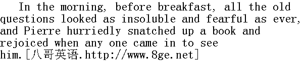 早上饿着肚皮的时候, 从前的一切问题仿佛又显得难以解决, 极为可怕了, 于是皮埃尔急忙拿起一本书来读, 每当有人来找他的时候, 他就感到非常高兴。 Sometimes Pierre remembered what he had been told of soldiers under fire in ambuscade when they have nothing to do, how they try hard to find occupation so as to bear their danger more easily. And Pierre pictured all men as such soldiers trying to find a refuge from life: some in ambition, some in cards, some in framing laws, some in women, some in playthings, some in horses, some in politics, some in sport, some in wine, some in the government service. "Nothing is trivial, nothing is important, everything is the same; only to escape from it as best one can," thought Pierre. "Only not to see it, that terrible it." 有时皮埃尔回忆起他所听到的故事, 故事中谈到, 士兵们作战时处于枪林弹雨之下, 他们躲在掩蔽体内, 这时无事可做, 为了经受起危险造成的威胁, 他们尽可能给自己找点事情做。皮埃尔仿佛觉得所有的人都是逃避人生的士兵: 有的人贪图功名, 有的人赌博成癖, 有的人编写法典, 有的人玩弄女性, 有的人贪爱玩物, 有的人骑马闲游, 有的人跻身于政坛, 有的人从事狩猎, 有的人好酒贪杯, 有的人国务倥偬。"既没有卑微人物, 也没有高官显贵, 横竖一样: 只想巧妙地逃避人生!"皮埃尔想道, "只想不目睹人生, 这种可怕的人生。"