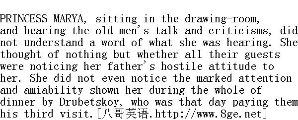 公爵小姐玛丽亚坐在客厅里, 静听老年人的流言闲语, 她对听见的话一点也不懂;心中只想到客人们是否正在注意她父亲对她的敌视态度。她甚至没有注意共进午餐时德鲁别茨科伊对她特别关心, 向她献殷勤, 他第三次到他们家里来访问。 Princess Marya turned with an absent-minded, questioning glance to Pierre, who, with a smile on his face, came up to her, hat in hand, the last of the guests, after the prince had gone out, and they were left alone together in the drawing-room. 公爵小姐玛丽亚现出漫不经心的、疑惑的眼神, 把脸转向皮埃尔, 在公爵走出去以后, 皮埃尔这个最后走的客人手里拿着一顶帽子, 脸上微露笑容, 走到她跟前, 他们单独地留在客厅里。 "Can I stay a little longer?" he said, dropping his bulky person into a low chair beside Princess Marya." 还可以再坐一会儿吗?"他把那肥胖的身子懒散地躺在公爵小姐玛丽亚身旁的安乐椅上时说道。 "Oh, yes," she said. "You noticed nothing?" her eyes asked." 啊, 可以, "她说。"您什么都没有发觉吗?"她的目光仿佛这样说。 Pierre was in an agreeable, after-dinner mood. He looked straight before him and smiled softly. "Have you known that young man long, princess?" he said. 皮埃尔在午餐后心情愉快。他两眼望着前面, 悄悄地微笑。"公爵小姐, 您老早就认识这个年轻人吗?"他说。