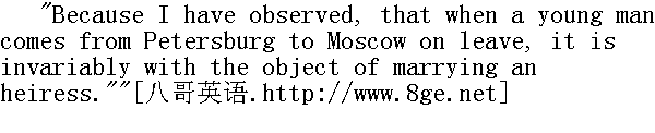 因为我观察到了: 这个年轻人平时总是从彼得堡坐车到莫斯科来休假, 其目的只是娶一个富有的未婚女子。" "Have you observed that?" said Princess Marya." 您观察到了这种事吗?"公爵小姐玛丽亚说。 "Yes," Pierre went on with a smile, "and that young man now manages matters so that wherever there are wealthy heiresses-there he is to be found. I can read him like a book. He is hesitating now which to attack, you or Mademoiselle Julie Karagin. He is very attentive to her."" 是啊, "皮埃尔面露微笑, 继续说下去, "目前这个年轻人是这样活动的: 那里有富裕的未婚女子, 他就到那里去。我把他看得一清二楚。他现今踌躇不前, 他要向谁发动进攻: 向您进攻呢, 还是向朱莉·卡拉金娜小姐进攻呢?Il est tres assidu aupres d'elle①." ①法语: 他很关怀她。 "Does he visit them?"" 他常到她们那里去吗?"