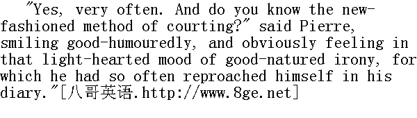 是的, 他常到那里去。您知道一种追求女人的新方式吗?"皮埃尔带着欢乐的微笑说, 显然他怀有善意讥讽的愉快心情, 正因为他有这种心情, 所以他常在日记上责备自己。 "No," said Princess Marya." 不晓得。"公爵小姐玛丽亚说。 "To please the Moscow girls nowadays one has to be melancholy. He is very melancholy with Mademoiselle Karagin," said Pierre." 目前要取得莫斯科的少女的欢心, il faut etre melancoli-que.Et il est tres melancolique aupres dm-lle卡拉金娜。②"皮埃尔说。 ②法语: 就应该抑郁寡欢。他在她面前显得非常抑郁寡欢。 "Really!" said Princess Marya, looking at the kindly face of Pierre, and thinking all the time of her own trouble. "It would ease my heart," she was thinking, "if I could make up my mind to confide all I am feeling to some one. And it is just Pierre I should like to tell it all to. He is so kind and generous. It would ease my heart. He would give me advice."