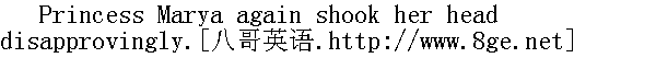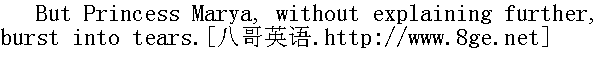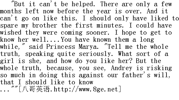 ①"公爵小姐玛丽亚说, 她两眼望着皮埃尔的仁慈的面孔, 不断地想到自己的痛苦, "若是我拿定主意, 把我感觉到的一切讲给什么人听, 我心里就会松快点儿。我恰恰愿意把这一切讲给皮埃尔听。他这样善良而且高尚。我希望变得松快一点。他给我出一个好主意吧!" ①法语: 是真的吗? "Would you marry him?" asked Pierre." 您愿意嫁给他吗?"皮埃尔问道。 "O my God, count! there are moments when I would marry any one"-to her own surprise Princess Marya said, with tears in her voice. "Ah! how bitter it is to love some one near to one and to feel," she went on in a shaking voice, "that you can do nothing for him, but cause him sorrow, and when you know you cannot alter it. There's only one thing-to go away, and where am I to go?"" 哎呀, 我的天啊, 伯爵!有时候我愿意嫁给任何人。"公爵小姐玛丽亚突然出乎自己意料, 带着哭泣的嗓音说, "噢, 爱一个亲近的人并且感觉到......(她的嗓音颤抖地继续说下去)除开痛苦之外, 你竟不能替他做什么, 当你知道你不能改变这种情况时, 你会多么难受啊。那末唯一的办法就是离开他, 但是我能到哪里去呢?" "What is wrong? what is the matter with you, princess?"" 公爵小姐, 怎么了, 您发生了什么事情?"