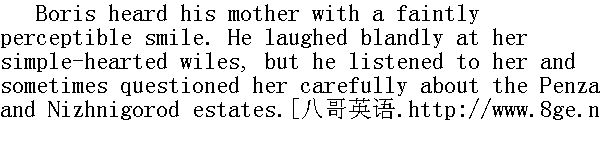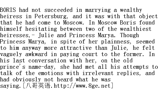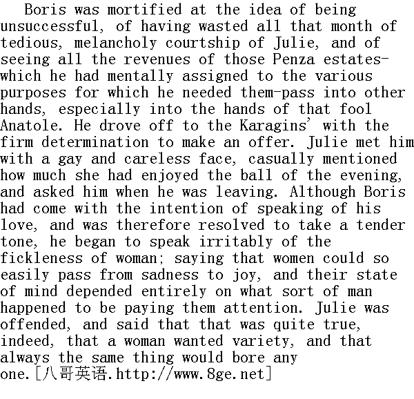 鲍里斯要在彼得堡娶一个有钱的未婚女子, 这件事没有办成。他抱定这种目的抵达莫斯科。在莫斯科, 鲍里斯在两个最富有的未婚女子--朱莉和公爵小姐玛丽亚--之间踌躇不前。公爵小姐玛丽亚尽管长得难看, 但是他觉得她比朱莉更迷人, 他不知为什么不好意思去追求博尔孔斯卡娅。最近在老公爵命名日和她会面时, 他试图和她谈情说爱, 但是她对他说的话回答得牛头不对马嘴, 显然她不想听他说话。 Julie, on the contrary, received his attentions eagerly, though she showed it in a peculiar fashion of her own. 与之相反, 朱莉尽管具备有特殊的才能, 但是她乐于接受他的追求。 Julie was seven-and-twenty. By the death of her two brothers she had become extremely wealthy. She had by now become decidedly plain. But she believed herself to be not merely as pretty as ever, but actually far more attractive than she had ever been. She was confirmed in this delusion by having become a very wealthy heiress, and also by the fact that as she grew older her society involved less risk for men, and they could behave with more freedom in their intercourse with her, and could profit by her suppers, her soirees, and the lively society that gathered about her, without incurring any obligations to her. A man who would have been afraid of going ten years before to a house where there was a young girl of seventeen, for fear of compromising her and binding himself, would now boldly visit her every day, and treat her not as a marriageable girl, but as an acquaintance of no sex. 朱莉已经有二十七岁子。她的兄弟相继去世之后, 她变得很富有了。她现在根本不漂亮, 但是她想到, 她不仅长得很好看, 而且比从前好看多了。可是, 以下两点却使她继续迷惘不解, 其一是, 她已经成为十分富有的未婚女子;其二是, 她年龄越大, 男人就认为她显得越可靠, 和她交游时不会不承担任何义务, 却遭到危险, 因而也越发自由。他们都享用她的晚宴和晚会, 充分利用在她家里聚会的颇为活跃的上流社会人士。十年前, 男人害怕天天登门拜访, 因为他们家里有个十七岁的小姐, 担心损害她的名誉, 同时也不愿意束缚自己, 而今每天都可以大胆地去看她了, 和她交际时, 不把她视为未婚的女子, 而把她视为没有性别的熟人。 The Karagins' house was that winter one of the most agreeable and hospitable houses in Moscow. In addition to the dinner-parties and soirees, to which guests came by invitation, there were every day large informal gatherings at the Karagins', principally of men, who had supper there at midnight and stayed on till three o'clock in the morning. Julie did not miss a single ball, entertainment, or theatre. Her dresses were always of the most fashionable. But in spite of that, Julie appeared to have lost all illusions, told every one that she had no faith in love or friendship, or any of the joys of life, and looked for consolation only to the realm beyond. She had adopted the tone of a girl who has suffered a great disappointment, a girl who has lost her lover or been cruelly deceived by him. Though nothing of the kind had ever happened to her, she was looked upon as having been disappointed in that way, and she did in fact believe herself that she had suffered a great deal in her life. This melancholy neither hindered her from enjoying herself nor hindered young men from spending their time very agreeably in her society. Every guest who visited at the house paid his tribute to the melancholy temper of the hostess, and then proceeded to enjoy himself in society gossip, dancing, intellectual games, or bouts rimes which were in fashion at the Karagins'. A few young men only, among them Boris, entered more deeply into Julie's melancholy, and with these young men she had more prolonged and secluded conversations on the nothingness of all things earthly, and to them she opened her albums, full of mournful sketches, sentences, and verses. 是冬, 卡拉金之家在莫斯科是最令人愉快的、殷勤好客的家庭。除开招待客人的晚会和宴会而外, 一大群人, 尤其是男人每天在卡拉金家里聚会, 深夜十一点多钟, 他们进晚餐, 在那里坐得太久, 坐到两点多钟。舞会呀, 游艺会呀, 戏剧呀, 朱莉不放过每次机会。她的服装总是最时髦的。尽管如此, 但是朱莉似乎对一切感到失望, 她逢人就说, 她既不相信友谊, 也不相信爱情, 也不相信人生的任何欢乐, 她只等待冥府的静谧。她学会了某个大失所望的姑娘的语调, 这个姑娘仿佛丧失了心爱的人, 或者受到了心爱的人的残酷无情的欺骗。尽管她没有发生这种事情, 但是大家还是那样看待她, 她自己甚至不相信, 她遭受了许多人世的痛苦。这种忧郁的心情并没有妨碍她寻欢作乐, 也没有妨碍那些常常到她家里来的青年愉快地消遣。每个经常到他们家里来的客人首先都对女主人的忧郁心情表示敬意, 然后才参与文雅的谈话, 跳舞, 智力游戏以及吟打油诗的比赛, 这是卡拉金家中风行一时的游戏。只有几个年轻人, 其中包括鲍里斯, 更加深入地体会朱莉抑郁寡欢的心情, 她跟这些年轻人单独地、更久地谈论尘世的空虚, 她打开几本纪念册, 给他们看看, 上面画满了悲伤的图案, 写满了格言和诗句。 Julie was particularly gracious to Boris. She deplored his early disillusionment with life, offered him those consolations of friendship she was so well able to offer, having herself suffered so cruelly in life, and opened her album to him. Boris sketched two trees in her album, and wrote under them: "Rustic trees, your gloomy branches shed darkness and melancholy upon me." 朱莉对鲍里斯特别亲切, 惋惜他过早地对人生失望, 给予他以她所能