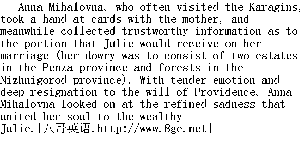 经常到卡拉金娜家里去的安娜·米哈伊洛夫娜在和朱莉的母亲凑成牌局的时候, 对朱莉的陪嫁, 作了实际的调查(为朱莉出阁而陪送奔萨省两处领地和下城森林)。安娜·米哈伊洛夫娜现出忠于天意和深受感动的神情观察那微妙的悲哀气氛, 而这种气氛把她的儿子和富有的朱莉束缚在一起。 "Still as charming and as melancholy as ever, my sweet Julie," she would say to the daughter. "Boris says he finds spiritual refreshment in your house. He has suffered such cruel disillusionment, and he is so sensitive," she would say to the mother. "Tojoursfcharmanteetmelancolique, cettechereJulie, " ②她对他们那家的女儿说, "鲍里斯说, 他只是在您家里, 心灵才感到安逸。他多少次心灰意冷, 而且深有感触。"她对朱莉的母亲说。 ②法语: 我们的可爱的朱莉还是那么迷人和忧悒。 "Ah, my dear, how attached I have grown to Julie lately," she would say to her son, "I can't tell you. But, indeed, who could help loving her! A creature not of this earth! Ah, Boris! Boris!" She paused for a moment. "And how I feel for her mother," she would go on. "She showed me today the letters and accounts from Penza (they have an immense estate there), and she, poor thing, with no one to help her. They do take such advantage of her!"" 啊, 我的亲人, 我近来多么依恋朱莉, "她对儿子说, "我无法向你形容啊!谁能不喜爱她呢?她是个多么非凡的人啊!噢, 鲍里斯, 鲍里斯!"她沉默片刻, "我多么怜悯她的妈妈, "她继续说, "今天她把从奔萨送来的帐目和信札拿给我看(她们有个偌大的领地), 她很可怜, 全靠自己一个人, 人家都欺骗她!"