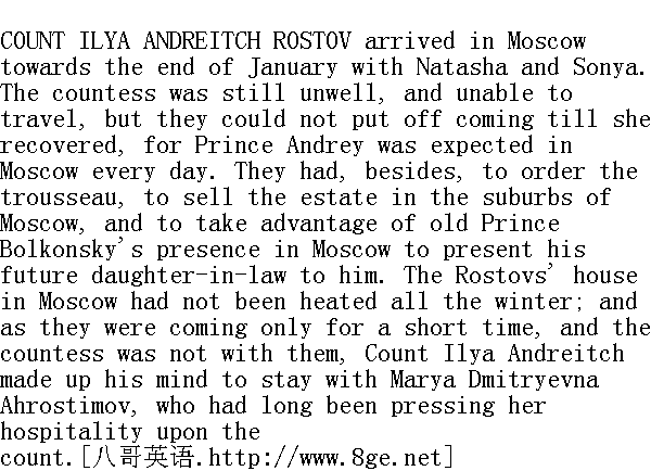 一月底, 伊利亚·安德烈伊奇伯爵偕同娜塔莎、索尼娅抵达莫斯科。伯爵夫人还在害病, 不能启行, --但是决不能等待她复原;他们天天等待安德烈公爵回到莫斯科;此外, 务必要购置嫁妆, 出售莫斯科近郊的田庄, 趁老公爵还在莫斯科的时候, 让他认识一下未来的媳妇。罗斯托夫之家在莫斯科的住宅没有生火, 此外, 他们来到莫斯科后只作短暂逗留, 伯爵夫人也不在他们身边, 因此伊利亚·安德烈伊奇决定临时住在莫斯科的玛丽亚·德米特里耶夫娜·阿赫罗西莫娃家中, 她老早就向伯爵表示, 她愿意殷勤接待他。 Late in the evening the four loaded sledges of the Rostovs drove into the courtyard of Marya Dmitryevna in Old Equerrys' Place. Marya Dmitryevna lived alone. She had by now married off her daughter. Her sons were all in the service. 深夜, 罗斯托夫之家的四辆雪橇开进了旧马厩街玛丽亚·德米特里耶夫娜的庭院。玛丽亚·德米特里耶夫娜独自一人住在这里。她把女儿嫁出去了。她的几个儿子都在机关里服务。 She still held herself as erect; still gave every one her opinions in the same loud, outspoken, decided fashion; and her whole bearing seemed a reproof to other people for every sort of weakness, passion, and temptation, of which she would not admit the bare possibility. In the early morning, in a house-jacket, she looked after the management of her household. Then she drove on saints' days to Mass, and from Mass to the gaols and prisons; and of what she did there, she never spoke to any one.On ordinary days she dressed and received petitioners of various classes, of whom some sought her aid every day. Then she had dinner, an abundant and appetising meal, at which some three or four guests were always present. After dinner she played a game of boston; and at night had the newspapers and new books read aloud to her while she knitted. It was only as a rare exception that she went out in the evening; if she did so, it was only to visit the most important people in the town. 她待人总是那么坦率, 在对任何人提出意见时, 总是那么爽快, 说话的声音洪亮, 意志坚定, 她仿佛以身作则, 诚恳地责备别人的各种弱点、情欲和嗜癖, 她不认为自己身上有这些毛病。大清早, 她就穿上短棉袄, 搞一点家务, 之后, 每逢节日去做日祷, 日祷完毕后便去寨堡和监狱, 她在那里从事什么活动, 她不向任何人透露, 在平日里, 她穿好衣裳后, 便来招待每天到她家里来的各个不同阶层的向他求援的人, 然后用午餐, 在味美而丰盛的午餐上, 经常有三四位来客, 在午餐之后打一圈波士顿牌, 晚上叫人给她读报, 给她读新书, 她一边听, 一边做针织活计。她很少破例驱车出门, 如果出门, 只不过是访问城里的高官显贵而已。 She had not gone to bed when the Rostovs arrived, and the door in the vestibule squeaked on the block, as the Rostovs and their servants came in from the cold outside. Marya Dmitryevna stood in the doorway of the hall, with her spectacles slipping down on her nose, and her head flung back, looking with a stern and irate face at the new-comers. It might have been supposed that she was irritated at their arrival, and would pack them off again at once, had she not at the very time been giving careful instructions to her servants where to install her guests and their belongings. 当罗斯托夫一家人抵达的时候, 她还没有上床睡觉, 接待室的门上的滑轮嘎吱嘎吱地响起来, 他们让罗斯托夫一家人和女仆从寒冷的户外走进来。玛丽亚·德米特里耶夫娜把眼镜拉到鼻梁上, 头向后仰, 站在大厅门口, 显露出气势汹汹的严肃而暴躁的神态望着走进来的人。可以设想, 她对进来的人不满, 假如这时候她不忙碌地吩咐仆人们把来客分别安置好, 同时把他们的行李一一放好的话, 人们真会以为她立刻要把客人赶出去。