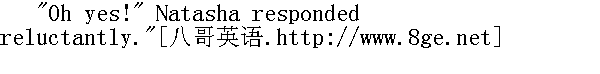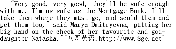 好, 好, 她们在我这儿万无一失。在我这儿就像在监护委员会里一样。她们该去什么地方玩, 我就带领她们去, 我可以骂骂她们, 抚爱抚爱她们。"玛丽亚·德米特里耶夫娜说, 她一面用她那只粗大的手触动一下她特别宠爱的姑娘和教女娜塔莎的面颊。 Next morning Marya Dmitryevna bore the young ladies off to Iversky chapel and to Madame Aubert-Chalmey, who was so frightened of Marya Dmitryevna that she always sold her dresses at a loss simply to get rid of her as soon as possible. Marya Dmitryevna ordered almost the whole trousseau. On their return, she sent every one out of the room but Natasha, and called her favourite to sit beside her arm-chair. 第二天早上, 玛丽亚·德米特里耶夫娜把两个小姐带到伊韦尔小教堂去, 后来又把她们带到奥贝尔·夏尔姆太太那里去, 她很惧怕玛丽亚·德米特里耶夫娜, 所以她常常亏本向她售出自己的衣服, 只是想叫她快点儿离开。玛丽亚·德米特里耶夫娜差不多定购了全部嫁妆。她回家后, 便把所有的人从房里赶出去, 只留下娜塔莎一个人, 叫她特别宠爱的姑娘坐在她的安乐椅上。 "Well, now we can have a chat. I congratulate you on your betrothed. A fine fellow you have hooked! I'm glad of it for your sake, and I have known him since he was that high"-she held her hand a yard from the floor. Natasha flushed joyfully. "I like him and all his family. Now, listen! You know, of course, that old Prince Nikolay was very much against his son's marrying. He's a whimsical old fellow! Of course, Prince Andrey is not a child, he can get on without him, but to enter a family against the father's will is not a nice thing to do. One wants peace and love in a family. You're a clever girl, you'll know how to manage things. You must use your wits and your kind heart. And every thing will come right."" 啊, 我们现在谈谈吧。我祝贺你有个未婚夫。你已经找到一个棒小伙子!我替你高兴, 他从小时候我就认识(她比划给她看, 离地一俄尺那样高)。"娜塔莎高兴得满面通红。"我喜欢他, 也喜欢他全家人。现在你听着。你要晓得, 年老的公爵尼古拉很不想要他儿子娶亲。一个神经质的老人啊!自然, 安德烈公爵不是毛孩子, 他不过问也能顺利地办成这件事, 不过违背家父的旨意进入家门总不太妙。一家人要和睦共处, 亲如手足。你是一个聪明人, 会应付自如。你要精明能干点, 妥善地应付过去。这样, 一切都会好起来。" Natasha was silent, not as Marya Dmitryevna supposed from shyness. In reality Natasha disliked any one's interfering in what touched her love for Prince Andrey, which seemed to her something so apart from all human affairs, that no one, as she imagined, could understand it. She loved Prince Andrey, and only him, and knew only him; he loved her, and was to arrive in a day or two and carry her off. She did not care about anything else. 玛丽亚·德米特里耶夫娜想到, 娜塔莎由于腼腆而默默不语, 但在事实上娜塔莎感到非常不愉快: 大家干预她爱安德烈公爵这种事, 在她看来, 这件事与众人的任何事情迥然不同, 按照她的观点, 谁也不能理解它。她只知道并且爱慕安德烈公爵, 他也爱她, 最近几天内要来接她。她再也不需要别的什么了。 "I have known him a long while, do you see; and Masha, your sister-in-law, I love. Sisters-in-law are said to be mischief-makers, but she- well, she wouldn't hurt a fly. She has begged me to bring you two together. You must go to see her to-morrow with your father, and be as nice as possible; you are younger than she is. By the time your young man comes back, you'll be friends with his sister and his father, and they will have learned to love you. Yes or no? It will be better so, eh?"" 你要明白, 我老早就认识他, 我也喜欢你的小姑子玛申卡。小姑子是好争吵的妇女, 可是这个小姑子连苍蝇也不会欺侮。她求我让她和你会会面。你明天和你父亲一起到她那里去, 你要对她表示亲热, 藉以博得欢心, 你比她年纪更轻。你的那个人抵达后, 你和他妹妹、他父亲都认识了, 他们都很喜欢你。对不对呢?这样岂不更妙?"
