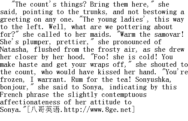 是伯爵的行李吗?拿到这里来, "她说道, 指着那几只手提箱, 但是没有同任何人打招呼, "小姐们, 向左转, 到这里来。喂, 你们干嘛要巴结!"她对几个丫头喊了一声, "热一热茶炊!--你长得更胖了, 变得更好看了!"她拽着把脸冻得通红的娜塔莎的风帽, 把她拖到身边来。说道, "嘿, 觉得冷吧!快点儿宽衣吧, "她对正想走到她跟前来吻吻她的手的伯爵喊了一声, "你冻僵了, 是不是?喝茶的时候, 你把糖酒端来吧!--索纽什卡, bonjour①。"她对索尼娅说, 她用法国话问好, 突出她对索尼娅的略嫌藐视的、温和的态度。 ①法语: 你好。 When they had all taken off their outdoor things, set themselves straight after the journey, and come in to tea, Marya Dmitryevna kissed them all in due course. 当大伙儿脱下外衣, 旅行后整理一下自己的服装, 走过来饮茶的时候, 玛丽亚·德米特里耶夫娜依次地吻吻大家。 "Heartily glad you have come, and are staying with me," she said. "It's long been time you were here," she said, with a significant glance at Natasha.... "The old fellow's here, and his son's expected from day to day. You must, you must make their acquaintance. Oh, well, we shall talk of that later on," she added, with a glance at Sonya, showing that she did not care to talk of it before her. "Now, listen," she turned to the count, "what do you want to do to-morrow? Whom will you send for? Shinshin?"-she crooked one finger. "The tearful Anna Mihalovna- two. She's here with her son. The son's to be married too! Then Bezuhov. He's here, too, with his wife. He ran away from her, and she has come trotting after him. He dined with me last Wednesday. Well, and I'll take them"-she indicated the young ladies-"to-morrow to Iversky chapel, and then we shall go to Aubert-Chalmey. You'll be getting everything now, I expect! Don't judge by me-the sleeves nowadays are like this! The other day the young princess, Irina Vassilyevna, came to see me, just as though she had put two barrels on her arms, a dreadful fright. Every day there's a new fashion. And what sort of business is it you have come for yourself?" she said severely, addressing the count." 你们光临敝舍, 并在我处下榻, 我由衷地高兴, "她说道, "早就应该来呀, "她说道, 意味深长地看看娜塔莎......"老头子在这里, 他儿子一两天内就能回来。应该、应该和他认识一下。哦, 这件事我们以后再谈吧。"她补充一句, 看了看索尼娅, 那目光表明, 她不想在她面前谈论这桩事。"现在请听着, "她向伯爵转过脸去说, "--明天你有何贵干?派人去把谁请来呢?把申申请来?她屈起一个指头, 把那个哭鬼安娜·米哈伊洛夫娜也请来, 两个人啦。她和儿子都在这里。儿子快娶亲啦!然后再请别祖霍夫, 是不是?他和妻子也在这里。他躲开她, 可是她乘马车来找他了。礼拜三他在我这儿吃了一顿午饭。啊, 她们呢, "她指指小姐们说, "明儿我带领她们到伊韦尔小教堂去, 然后我们顺路到奥贝尔·夏尔姆时装店去一趟。你们大概都要做新衣裳吧?不要拿我的衣袖来说吧, 瞧, 就是这个样儿!前几天, 年轻的公爵小姐伊琳娜·瓦西里耶夫娜到我这儿来了, 看看她, 真吓人啊, 她手上套着两个大圆桶。如今一日一个新式样。你本人要办什么事儿?"她把脸转向伯爵, 严肃地说。 "Everything has come together," answered the count. "There's the girl's rags to buy; and now there's a purchaser turned up for the Moscow estate and the house. If you'll graciously permit it, I'll choose an opportunity and drive over to Maryinskoe for a day, leaving my girls on your hands."" 各种情形都凑在一起了, "伯爵答道, "要给姑娘们购买各式各样的衣服, 这儿还有个买主, 他要买莫斯科近郊的田庄和住宅。如果您能够开恩, 我就要选择个时间到马林斯科耶去一天, 把我两个小姑娘交给您照管。"