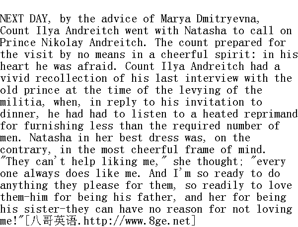 次日, 伊利亚·安德烈伊奇伯爵听从玛丽亚·德米特里耶夫娜的劝告, 偕同娜塔莎乘车到尼古拉·安德烈伊奇公爵那里去了。伯爵怏怏不乐地准备出去访问, 他感到害怕。他和老公爵最后一次相会适值征兵时期, 当时他未能如数提供民兵, 因此老公爵在回答他的宴请时, 厉声呵斥他, 他对这次会面记忆犹新。娜塔莎穿了一身华丽的连衣裙, 她相反地感到心情愉快。"他们是不会不喜欢我的。"她想道, "人人总是疼爱我的。我心甘情愿地为他们做他们希望我做的一切, 因为他是父亲, 我心甘情愿地爱他, 因为她是妹妹, 我也心干情愿地爱她, 他们哪能无缘无故地不疼爱我呢!" They drove to the gloomy old house in Vosdvizhenka, and went into the vestibule. 他们驶近了弗兹德维仁卡街一幢古旧的阴森森的住宅, 走进了外屋。 "Well now, with God's blessing," said the count, half in jest, half in earnest. But Natasha noticed that her father was in a nervous fidget as he went into the entry, and asked timidly and softly whether the prince and the princess were at home. After their arrival had been announced, there was some perturbation visible among the prince's servants. The footman, who was running to announce them, was stopped by another footman in the big hall, and they whispered together. A maid-servant ran into the hall, and hurriedly said something, mentioning the princess. At last one old footman came out with a wrathful air, and announced to the Rostovs that the prince was not receiving, but the princess begged them to walk up. The first person to meet the visitors was Mademoiselle Bourienne. She greeted the father and daughter with marked courtesy, and conducted them to the princess's apartment. The princess, with a frightened and agitated face, flushed in patches, ran in, treading heavily, to meet her visitors, doing her best to seem cordial and at ease. From the first glance Princess Marya disliked Natasha. She thought her too fashionably dressed, too frivolously gay and vain. Princess Marya had no idea that before she had seen her future sister-in-law she had been unfavourably disposed to her, through unconscious envy of her beauty, her youth, and her happiness, and through jealousy of her brother's love for her. Apart from this insuperable feeling of antipathy to her, Princess Marya was at that moment agitated by the fact that on the Rostovs' having been announced the old prince had shouted that he didn't want to see them, that Princess Marya could see them if she chose, but they were not to be allowed in to see him. Princess Marya resolved to see the Rostovs, but she was every instant in dread of some freak on the part of the old prince, as he had appeared greatly excited by the arrival of the Rostovs." 啊, 祈祷上帝保佑吧, "伯爵有点开玩笑地、有点严肃地说, 但是娜塔莎已经发现, 她父亲走进接待室时慌张起来, 他显得羞怯, 低声地问公爵和公爵小姐是不是在家。仆役通报他们到达之后, 公爵的仆役们之间出现了一阵慌乱。一名跑去通报的仆役在大厅里被另一名仆役拦阻, 他们低声说着什么话。一个丫头跑进了大厅, 也着急地说了些什么, 提到了公爵小姐。后来有一个怒形于色的老仆役走来禀告罗斯托夫家里人, 说公爵不能接见, 公爵小姐请他们到她面前去。布里安小姐头一个走出去迎接客人。她分外恭敬地迎接父女二人, 领他们去见公爵小姐。公爵小姐脸上泛起了一阵阵红晕, 显现出惊惶不安的神色, 她迈着沉重的脚步跑出去迎接客人, 但是她徒然装出一副无拘无束的、待人周到的好客的样子。公爵小姐玛丽亚乍一看来不喜欢娜塔莎。她好像觉得她的装束过分讲究, 显得快活而轻浮, 很慕虚荣。公爵小姐玛丽亚不知道, 在她尚未看见未来的嫂嫂之前, 她因为情不自禁地妒嫉她的姿色、年轻和幸福, 又因为忌妒她哥哥对她的爱情, 所以她已经对她怀有恶意了。除开这种不可克服的反感, 公爵小姐玛丽亚这时候还感到激动不安, 当仆人通报罗斯托夫家里人来访的这一瞬间、公爵叫喊起来, 说他无须乎会见他们, 如果公爵小姐玛丽亚愿意的话, 就叫她去接见好了, 他不允许他们去见他。公爵小姐玛丽亚决定接见罗斯托夫家里人, 但是她时刻担心, 深怕公爵表现出乖常行为, 由于罗斯托夫家里人的来访, 他似乎显得非常激动。 "Well, here I have brought you my songstress, princess," said the count, bowing and scraping, while he looked round uneasily as though he were afraid the old prince might come in. "How glad I am that you should make friends....Sorry, very sorry, the prince is still unwell"; and uttering a few more stock phrases, he got up. "If you'll allow me, princess, to leave you my Natasha for a quarter of an hour, I will drive round-only a few steps from here-to Dogs' Square to see Anna Semyonovna, and then come back for her." 可爱的公爵小姐, 您瞧!我给您带来了我的歌手。"伯爵说, 一面并脚致礼, 一面不安地回头观看, 好像他害怕老公爵会走过来, "你们互相认识了, 我多么高兴, 公爵老是生病, 很遗憾, 很遗憾。"他还说了几句一般的话, 便站起来, "如果允许的话, 我把娜塔莎留给您照管一刻钟, 我到养狗场安娜·谢苗诺夫娜那里去一趟, 离这里很近, 只有几步路远, 之后我来接她。" Count Ilya Andreitch bethought himself of this diplomatic stratagem to give the future sisters-in-law greater freedom to express their feelings to one another (so he told his daughter afterwards), but also to avoid the possibility of meeting the prince, of whom he was afraid. He did not tell his daughter this; but Natasha perceived this dread and uneasiness of her father's, and felt mortified by it. She blushed f